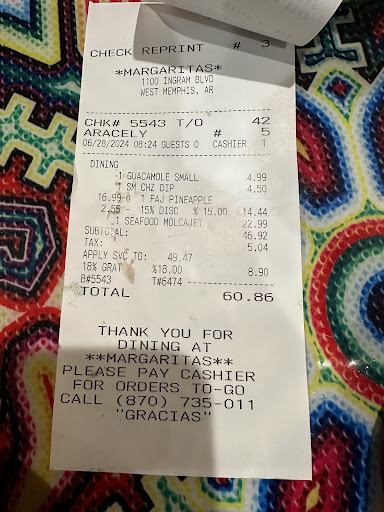 Read moreJust left on a Saturday night. We self seated and were greeted within 10 minutes. We put in an order for drinks and food and sat for an hour receiving neither. Eventually the waitress asked the manger to get the drinks and he rushed them out to us. We waited another 20 minutes for food. The fajitas were overcooked but the flavor was ok. We had ordered a queso which was not originally brought out. When asked the waitress went to the back and brought it immediately. The queso had a stiff layer on top which made me believe it had been poured just not brought out in a timely manner. We ordered another round of drinks which came quickly. At the end of it all the server brought the tab which included an 18% gratuity. The menu said the gratuity is added on all party of 6 or over. There was only 2 of us. Apparently there is a handwritten note on the door (one of several) that said its mandatory gratuity on all checks Friday and Saturdays. I don't mind tipping but had i know i would be charged 18% I would have left 45minutes after I ordered and was still sitting with an empty table. When I inquired about the tip % the manager argued that she deserved it because thats how they make a living. I never said I wouldn't tip iI just didn't think this kind of service is worth 18%. The manager knows he had to make a special request to even get our drinks out so the idea he would argue about deserving 18%...