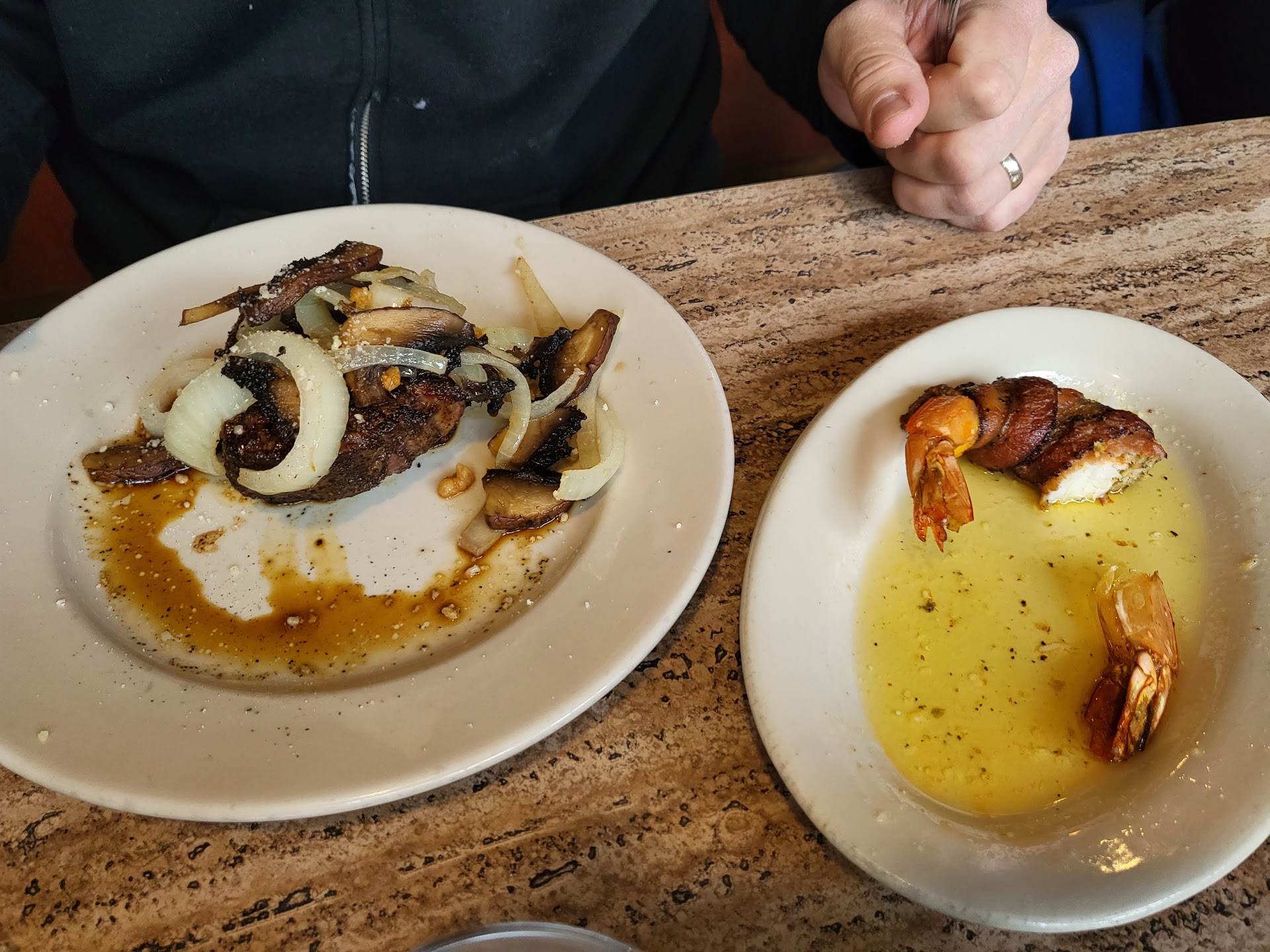 I ordered to scallops with bacon wrapped and a plain burger. My wife ordered a seafood portabella mushroom, all of the food options were rather small. First, the bacon wrapped scallop were over cooked with the bacon being overcooked. The scallops were rather bland, so they give you a bowl of butter to dip it in. My burger wasn't cooked to order, I wanted medium rare, I go med well to well done. The bun was rather hard and burger overall was subpar and no seasoning, strike three.