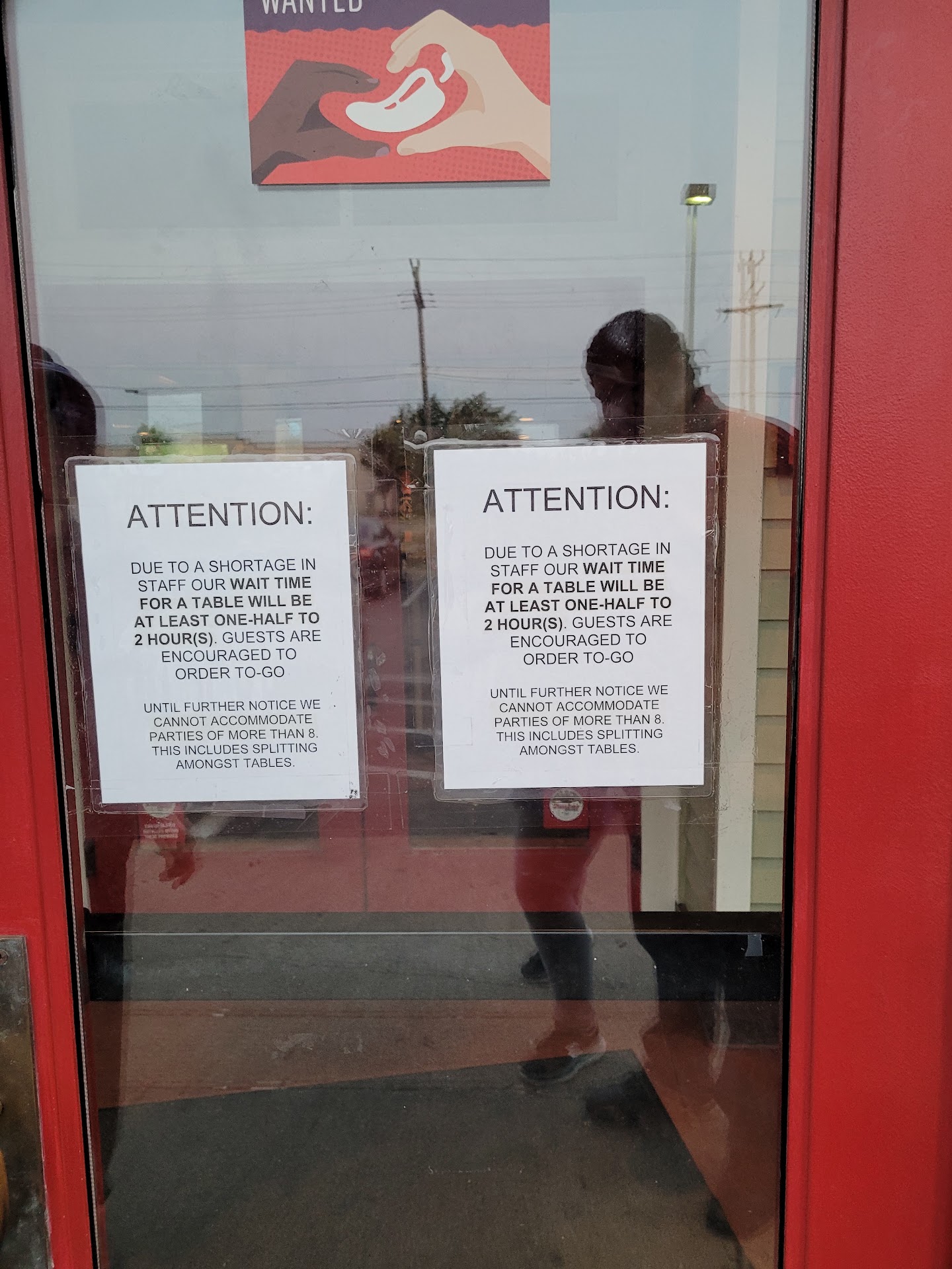 Read moreCame to pick up my door dash order a minute after they closed. The food order was sitting on the to go shelf. The doors work locked so I knocked on both entrances saying I simply was to grab that order and the security guard screamed at me through the window. I don’t think she was listened at all. She kept just shouting corporate policy we’re closed! get off the property. I was along side a child who left to get something from their parents car and was trying to return to their family also being denied entry while still dining there. This level of inhospitablality at a restaurant is just diabolical. I had to come back and take a picture of the store closed as door dashes corporate policy so I needed a picture of her since every table was full and looked like they were open. I think she called the cops on me for coming back and snapping a picture. She looked like her red face was about to explode. I went to pick up another order down the street next and when I drove chili’s 10 mins later by 3 cops cars were leaving the parking lot. I also eat here regularly but will not be coming back after how rudely I was treated as an independent contractor they hired through a 3rd party just trying to transport one of their customers orders. My guess is the security guard was hungry and trying to get free food. I ate dinner here earlier in the week on Tuesday night… food is always good but service is usually terrible. My drink from the bar never came (just a can of seltzer) server no where to be found, asked for my drink 3 different times after the food came from multiple employees. Drink finally came half way into my meal and was never comped. No wonder they can’t keep staff other than...
