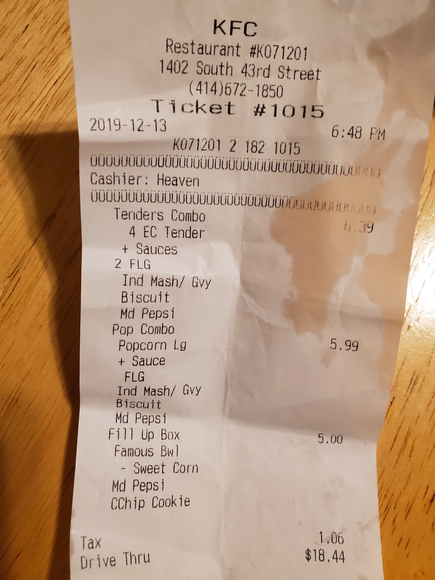 Ā Ā Ā Read moreThe location on 108th the chicken is not seasoned like KFC but is moist and there was an active adult working but I decided to try 43rd st location SADLY. I was at this location around a year ago was told they ran out of chicken. I stopped back 2wks later to treat my neighbors so ordered 2 8 piece buckets of chicken around $10 a bucket just chicken, order taker team that took my order carried themselves well. Chicken taste okay! Went ordered a bucket today all 4 employees had an attitude that I talked nice to since I was a customer/guest of their KFC place of employment. Now $20 a 8 piece bucket of just chicken. And it tastes terrible actually nasty the seasoning coating was tuff, chicken cold as if it had been put in a microwave or was sitting in the warmer from the other day!! It's not just the employees, IT'S THE CORPORATE DECISION MANAGEMENT, GREED, MAY BE THE OWNER IF PRIVATELY OWNERSHIP, But whatever it is the food and employees at this location stink. I'M SHARING BECAUSE IF I HAD READ SOME OF THE REVIEWS I WOULDN'T HAVE WASTED MY TIME THERE ARE OTHER FAST FOOD CHICKEN RESTAURANTS. DON'T GO TO THIS LOCATION SAVE YOUR SELF A BIG...
