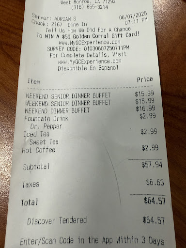 Read moreIf I could give NO stars, I absolutely would!!! I wish I had thought to ask what the health rating was because I didn't see it, BUT it has to be -100. My family and I are headed back home from a 5 day vacation in Texas and wanted something that was familiar and something affordable that has always been good to us, so we stopped at this Golden Corral. Stopping here was a grave mistake from the first red flag walking in!! The atmosphere is dirty and nasty. The employee at the front cash register was slouchy and inattentive. My girls had to use the bathroom emergent when we entered the building and before we could finish paying for the meal, they returned talking about how disgusting the bathroom was...so disgusting that they knew I would not want to go in. Luckily, the manager walked up, and I told her, and she directed me to a "family" bathroom....it was better than what my daughters had described from the other bathroom. However, still not 100%. The dining room on the side where the bathrooms were smelled awful, just not sure if it was because there is a sewer issue or because it was just that close to the nasty bathrooms. Fast forward to the food... although the presentation wasn't good, in fact everything looked kinda bland and gross..I just picked some things that are generally ok and hard to mess up. Once again,....HIGHLY DISAPPOINTED!! The food was basically cold...luke warm if not ICE COLD. There was nothing I had that was hot or tasted real fresh. I gave up and realized I had made a horrible recommendation to my family and immediately felt bad. We left with less money and hungry stomachs!! DO THE WORLD A FAVOR AND SHUT THIS GOLDEN CORRAL DOWN!! If you read this and value your money or even your digestive system... DO NOT STOP, KEEP GOING!!...