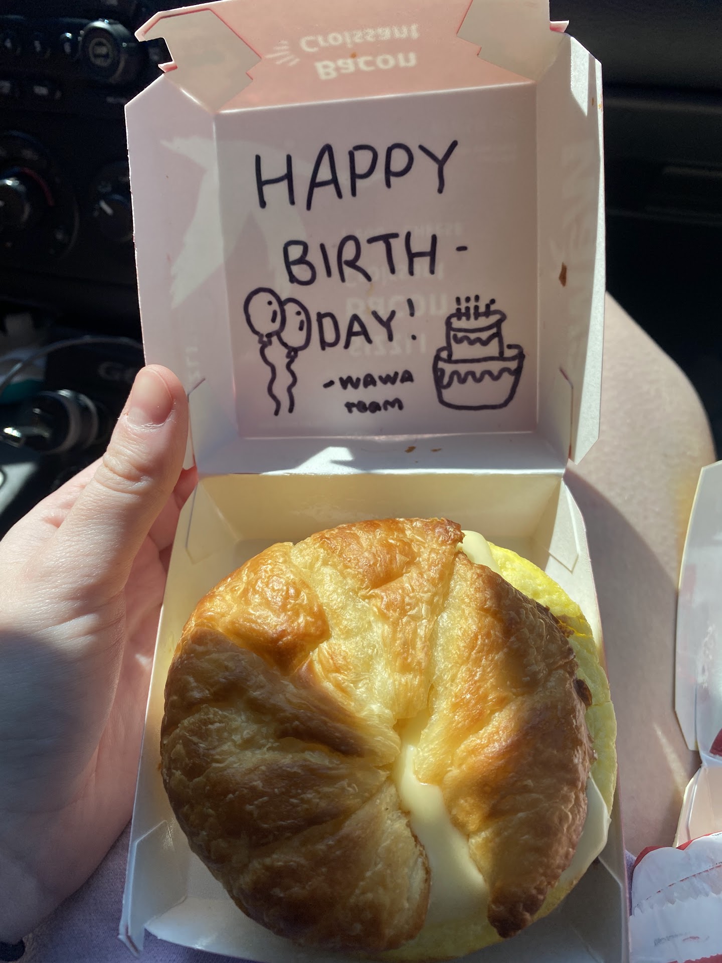 I just stopped in at this location after a bad start to my birthday looking for my favorite croissant sizzli. I was sad to see none in the warmers so I asked the gentleman making drinks if they had more in the back and after checking was told they were fully out of croissants. I was a little disappointed but understood and went to pick another variety when he came rushing over to tell me they found another croissant hidden in the back and could make the croissant sizzli I wanted originally! I almost cried I needed something to go right this morning so badly and thanked him and said it’s my birthday that would be amazing if they could make it. After a short wait another young woman delivered me my sizzli and I thanked her and the gentleman before getting in my car. I finally opened my box to find this hand written birthday wish which truly made my day and turned it around. I’ve always loved Wawa for their service and food but this really solidifies why they’re better than the rest. Thank you thank you to those kind workers (I wish I had gotten their names). Keep doing...