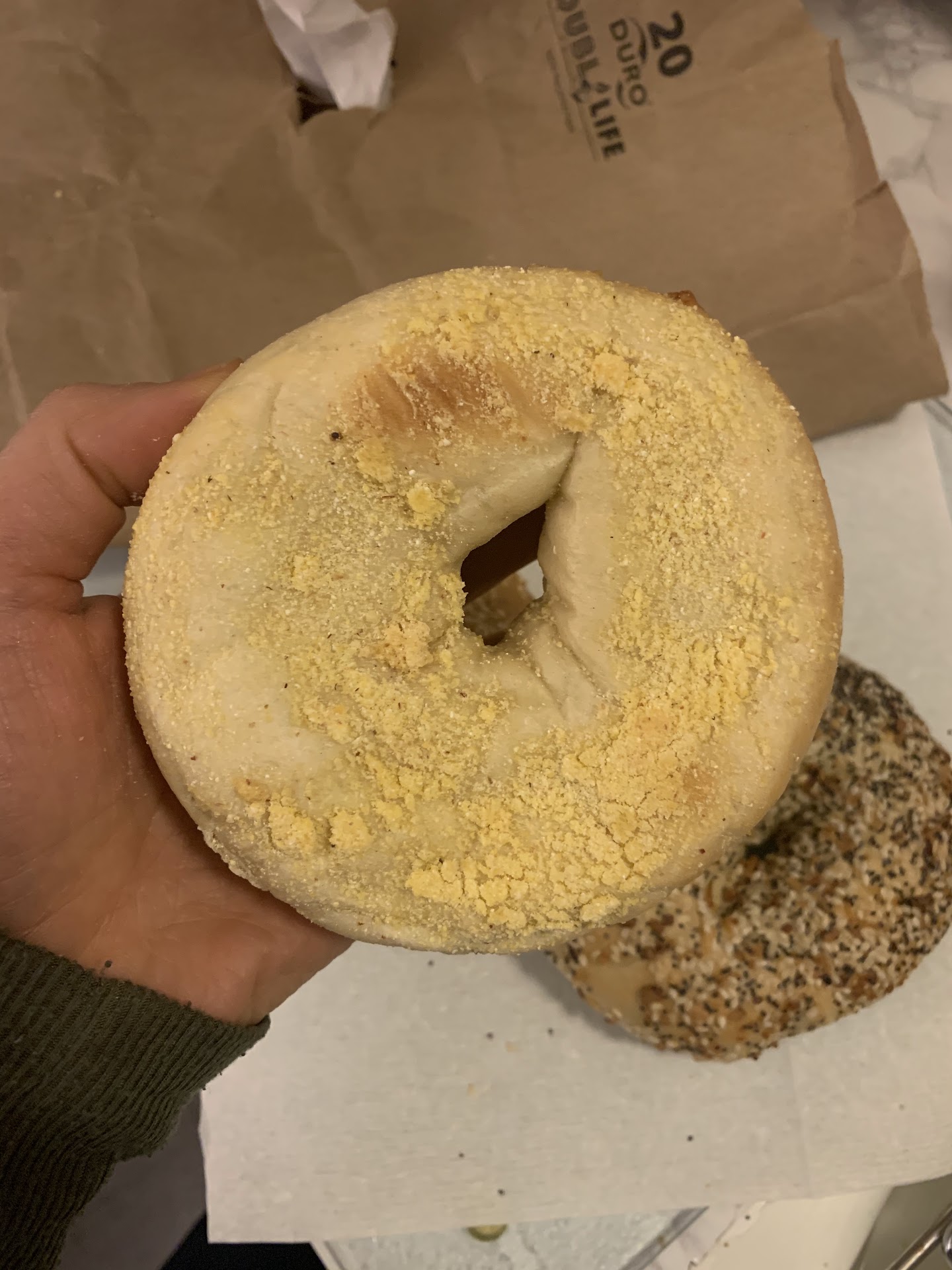 Another negative I must add is that some of the bagels that I bought seemed a little stale by the time we ate them later in the afternoon. I know bagels obviously are the best when they're fresh out of the oven, but I was a little surprised how hard they were after only a couple hours after buying. There was also a bunch of flour crusted onto a plain bagel that I received.. not the most appealing thing to look at.