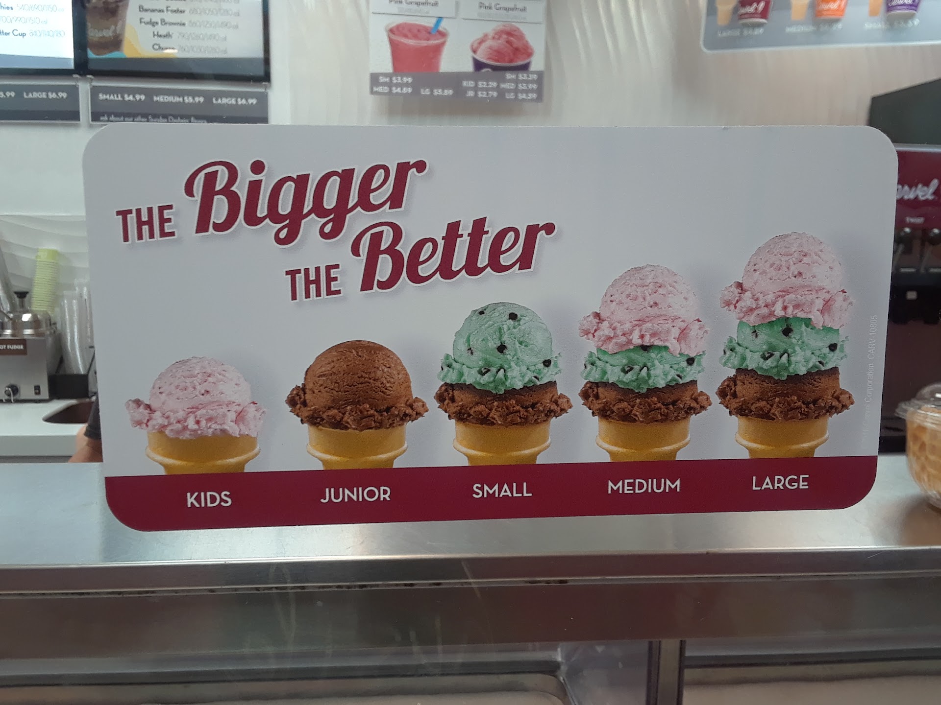 The worker asked what size ice cream I wanted and I said "a medium cup". She told me that a medium was only 2 scoops. I pointed to the scoops size chart on the glass and told her it was 3 scoops on there. She said all she knows is that a medium is 2 scoops. I repeated that the picture showed 3 scoops. The worker said she could not see it because it was not facing her. I motioned for her to come around and look at it, but she refused. She was acting like she was in a hurry, even though there was only 1 other person waiting.