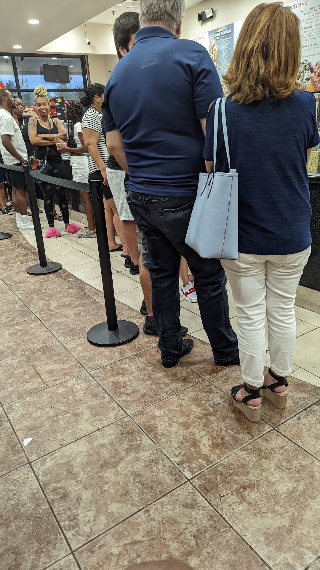 After being on line for an hour outside and finally getting up to the door, 1 couple which I saw them arrive 10 minutes prior, came to the door saying they said come right in for pickup. I shared that we have all been out there long waiting and they can't jump the line. The guy was nice enough to engage conversation, and shared t hm at they just stood there and ordered on the website. The order was not ready, of course, because it was just put in. But the guy stopped to pull her order from the machine and completed her order before the lined up customers before them. This was unacceptable and several customers were disturbed by how things were being handled. A large family from several cars arrived and gathered by the door looking in. They began placing their orders online and coming in for pickup. Concern and request ti handle present customers first was immediately expressed by the inside and front of outside line. We asked for a manager and was refused and disregarded. A few of us said we would be reporting this. The guy shrugged his shoulders saying do what you want - "manager said online orders has priority" . They fill those first and as they come in. I said that makes no sense when you have a overflowing line in here and down the strip. He said, "well that's what we were told to do" and continued taking his (slow) time with that order. They used the same gloves to handle everything (ice cream, utensils, equipment, exchange of money, receipts, counters, etc. We commented on them doing that, but no action was taken (guessing because the customer being served wasn't saying it) until it was my sister's turn, she requested a new pair of gloves be used before handling anything else, and he did. I lost all interest of having anything, and only stayed because my family didn't want to leave after waiting so long. The whole experience left me feeling angry, frustrated and disregarded as a customer. They lacked professionalism and was a bad representation of the...