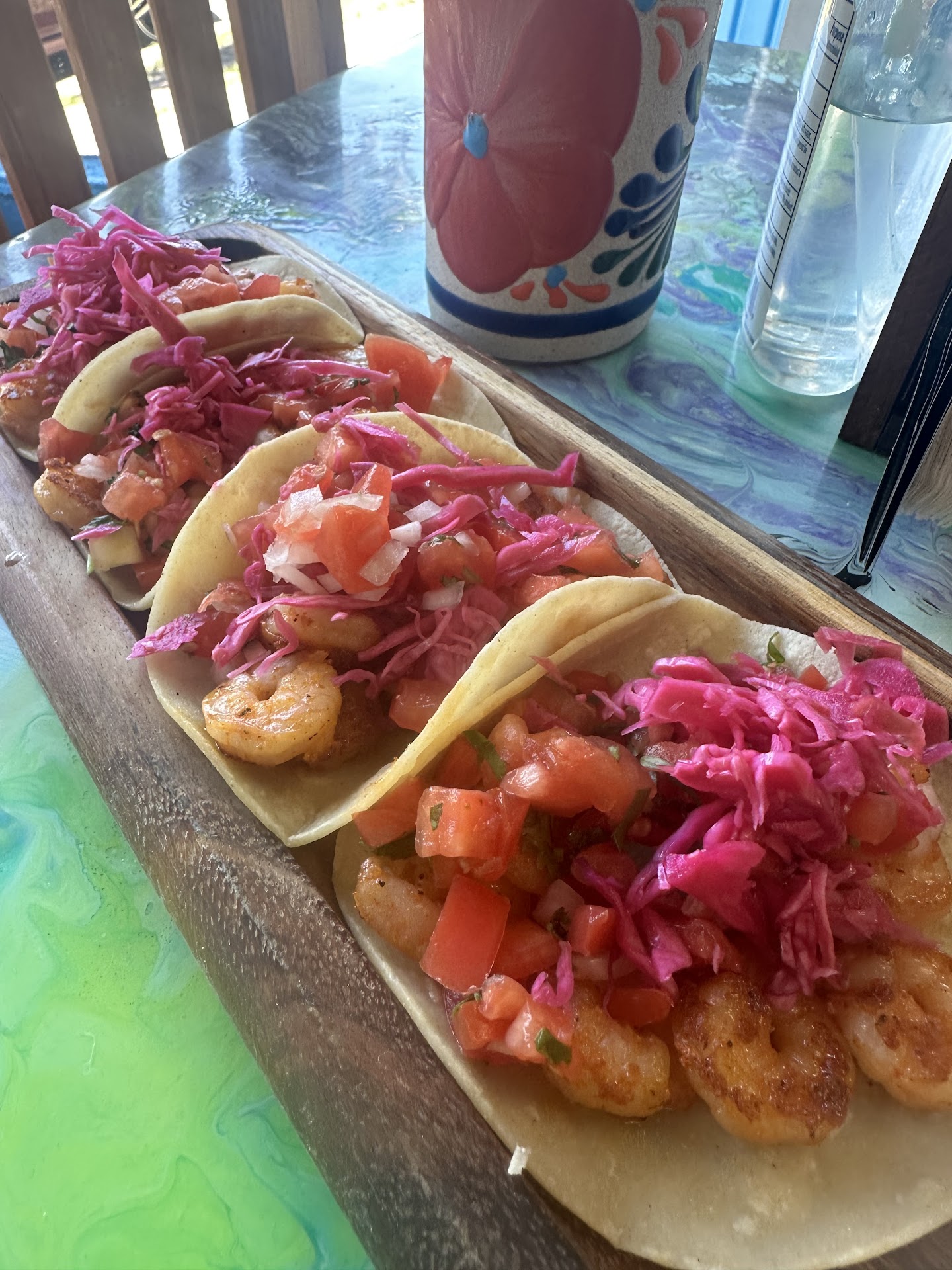 I decided to try the shrimp tacos based on Sonya's suggestion, and they did not disappoint. Each taco was generously loaded with perfectly cooked shrimp, nestled in a soft corn tortilla and topped with fresh onions and cilantro or mixed cabbage. The side of salsa verde and aioli was the perfect complement, adding a burst of flavor to every bite. With four tacos per order, it was a satisfying and hearty meal.