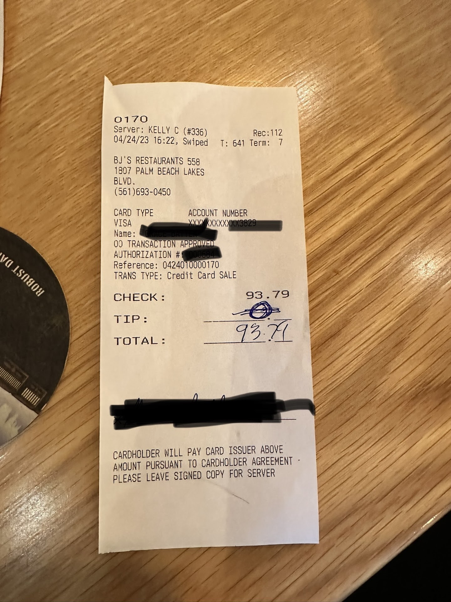I said something about what happened with my food and drink and Joe argued with me as if it was my fault my food and drink were dumped. I asked for my check and was refused as if this solved and absolved the poor service and behavior. (*Other details available for the BJs corporate)