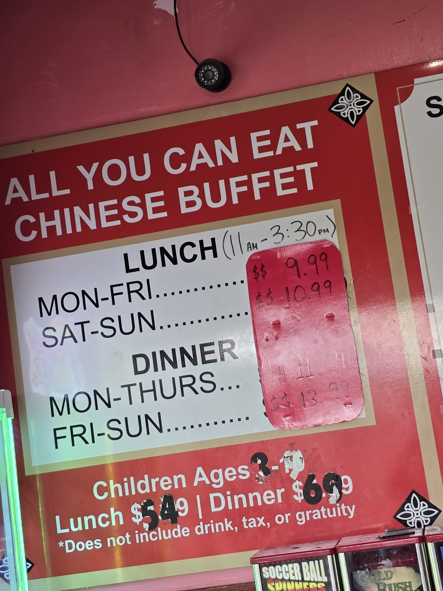 Read moreI should have known how terrible the food was by looking at the shifty decor on the outside of the building. Me and my gf walked in and immediately smelled rotten fish in the air. My gf told me we should just try the food anyways. Worst decision of my life. There was NO selection of food besides raw chicken and sea food. The lo mein was disgusting and had a thick slimy cream on it as well as all their general chicken. The waitress looked upset that we ate 2 bites from our plates and had to throw them away. She then proceeded to hound our table like a shark and stood there and watched me write on the tip part of the check. Well too bad for her I still wrote $0.00 for her and “food was terrible get new cook” on check. Don’t go too this place it’s a waste of money and you will end up writing your own terrible review. Hopefully you don’t get food poisoning in...