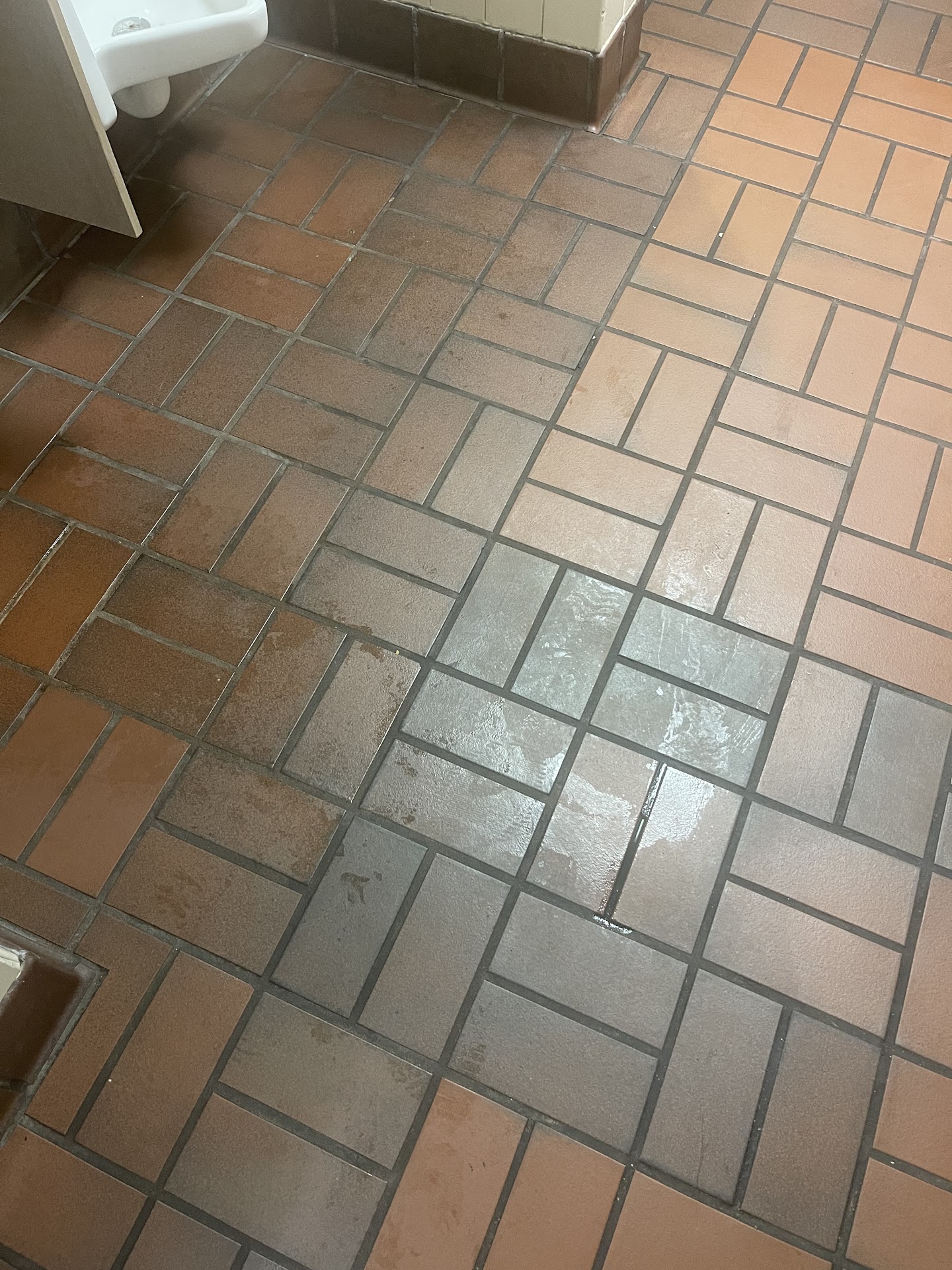 The floor under the urinals was covered in pee. When I say covered, it was in the middle of the bathroom; I won't go into any theories as to why this was the case.