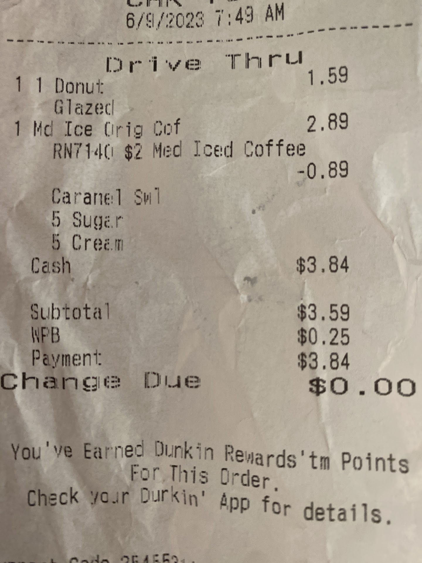 Ā Ā Ā Read moreWorst Dunkin experience by far. The $2 upcharge for the 4 ounces of oat milk would normally be the worst offender but it was the actual customer service that made the experience terrible. Made a hot coffee instead of the iced I specified twice when I ordered, and rudely comments "well you said you wanted hot" instead of apologizing for the miscommunication. When I ask to void the transaction and reimburse me for the error (as I had already applied a $3 credit to what would normally be a $3.63 drink at any other dunkin and here they were asking $4.85) they comment they "could not" do that for me while also denying that they would make me the correct coffee, as."it would've costed more" despite them getting my order wrong in the first place. Didn't even finish paying, take the credit, no reason to spend nearly $5 on a place that treats you worse than a dollar bill.