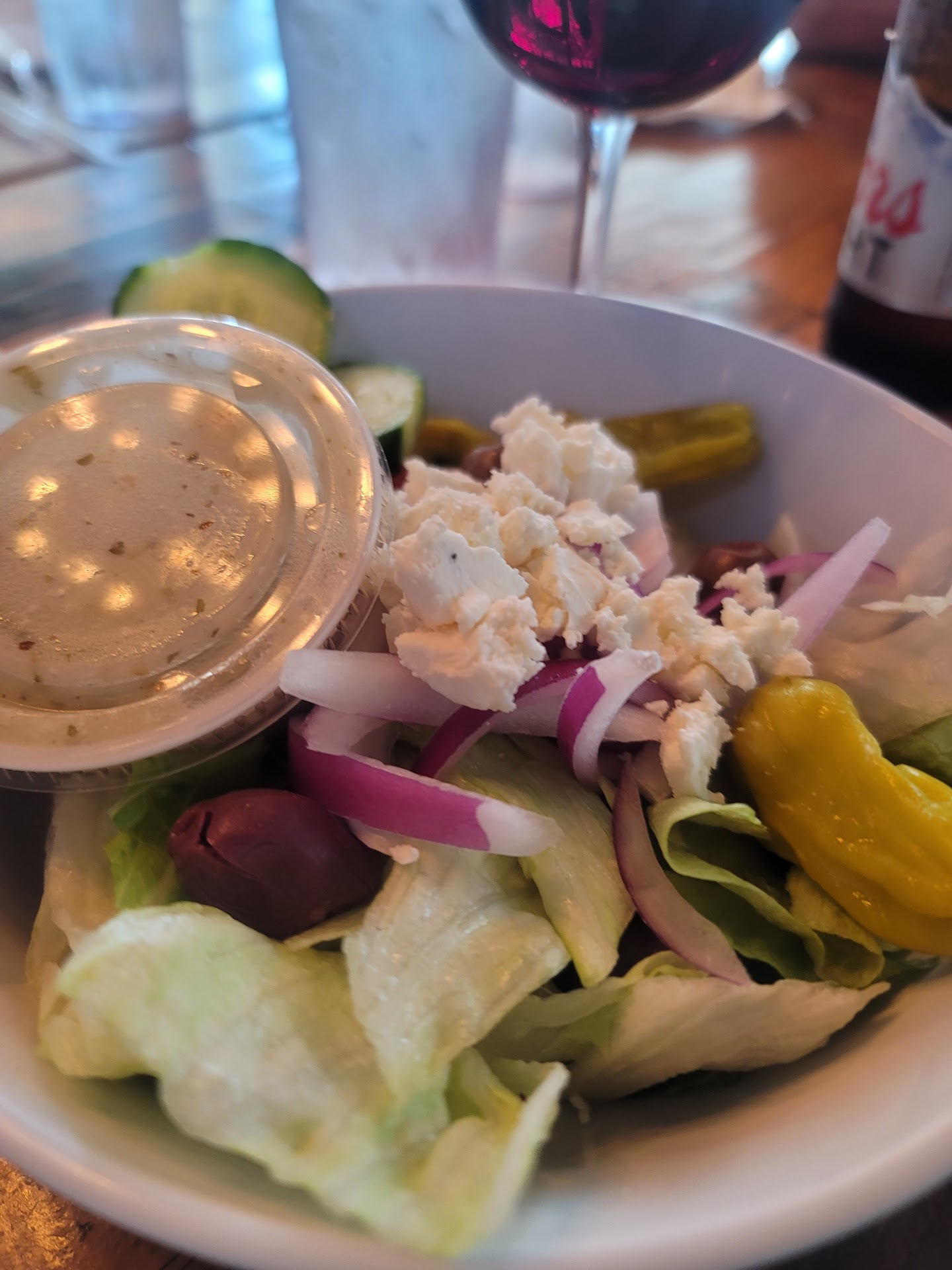June 7, 2022-My favorite restaurant on my day off with Puppy! Outside seating is perfect! Late lunch! Completely covered out of the sun with a nice East West breeze even when it’s hot outside! Monique and Michael are amazing! Welcoming and you always feel like family! They just had a packed restaurant for lunch on a Tuesday! That truly speaks to how amazing the food and service is!! Monique appears with a cold crisp Pinot Grigio for me! Wow! Fabulous! I ordered my newest favorite “ Greek Salad with Grilled Shrimp! (Refer to my pictures) It’s huge with 5 very large grilled shrimp! I took half home! I also took home their decadent Big Dig chocolate cake! You must have dessert or take it home! Homemade desserts are delicious! It always feels like home! Can’t wait till my next day off!
