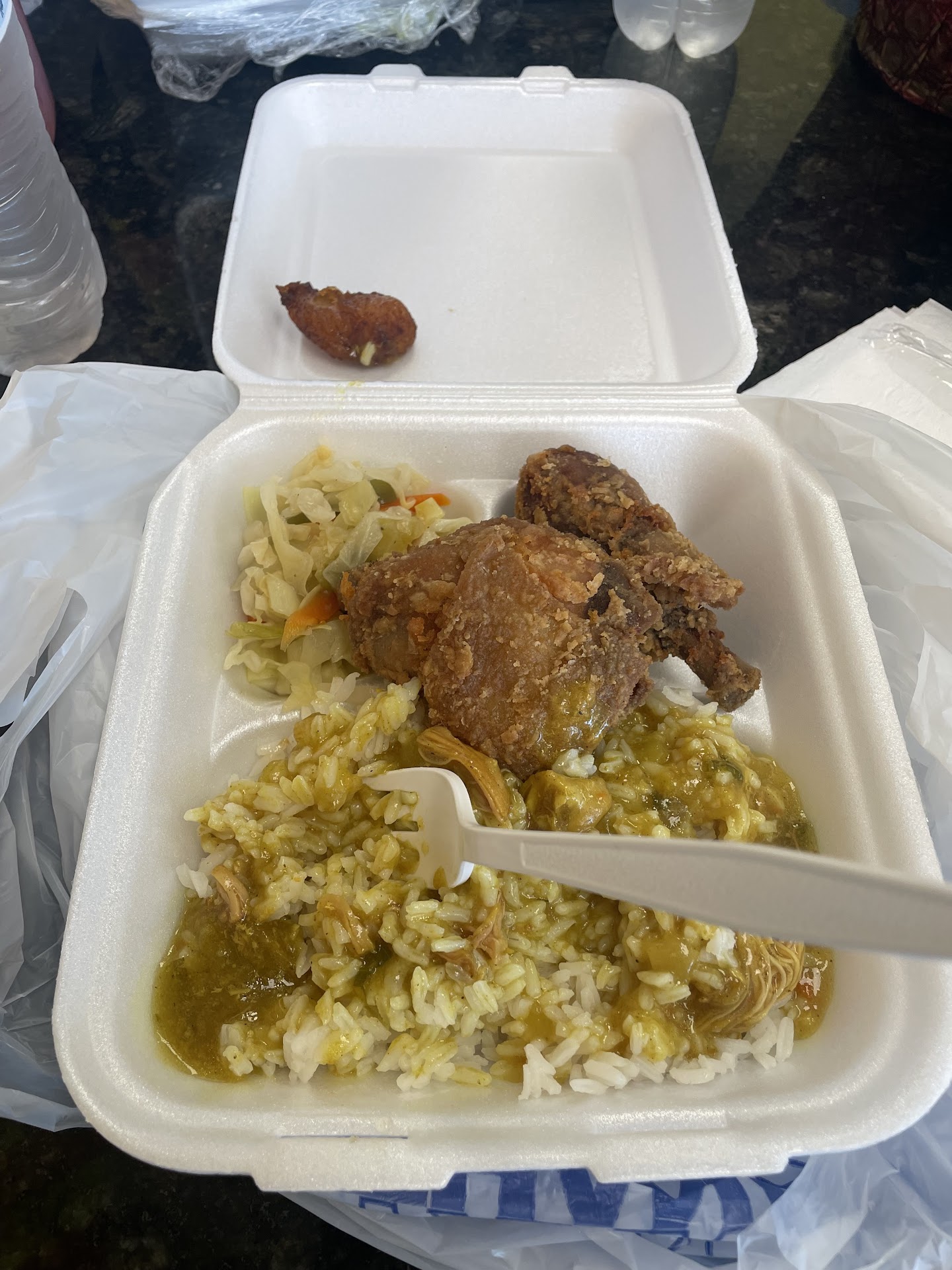 Ā Ā Ā Read moreI was there to get lunch with some people. When we got there there wasn't an organized way of taking orders, it seemed like 1 person came to take one persons order, and she went and then checked them out and got swamped with other customers. It took awhile before someone else came over and helped us, as well as the line that formed, but then again it was only 1 person, meanwhile there were 3 other people around. I ordered curry chicken, and while I was eating it, I noticed some red pieces and blood on the chicken and I knew it wasn't done. I told them at the front and the lady took my food to the back to show the owner. When she came back, she told me my only options were the curry chicken or brown stew chicken. At that point, I didn't want any more curry chicken because I didn't know the condition of it. I asked for fried chicken, instead and she didn't want to give me that. When she did, I was only given 2 pieces, and by the looks of it, she gave me a kids meal with the one scoop of cabbage. I had to ask for sauce on my rice, even though it wasn't a lot of that anyway. On top of that, another person in my party, her chicken also wasn't done and the older lady who works there tried to tell her that's how it's supposed to look. The older lady didn't want to give her a new plate at all. Overall, I don't think I will be back to this location...