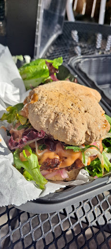 Here's what happened. Veggie Burger w/ added Guacamole on a gluten free bun - The patty was lobster patty style with corn. Very nice crisp deep fry on the outside and soft middle crab cake texture and seasoned similar to crab cake taste. It comes with a side option, I chose salad. It was Cantina style with Mexican seasonings and chop. Loved the bun (gluten free) that was sort of a firm biscuit texture but still quite bun likeĀ andĀ tasted lovely.