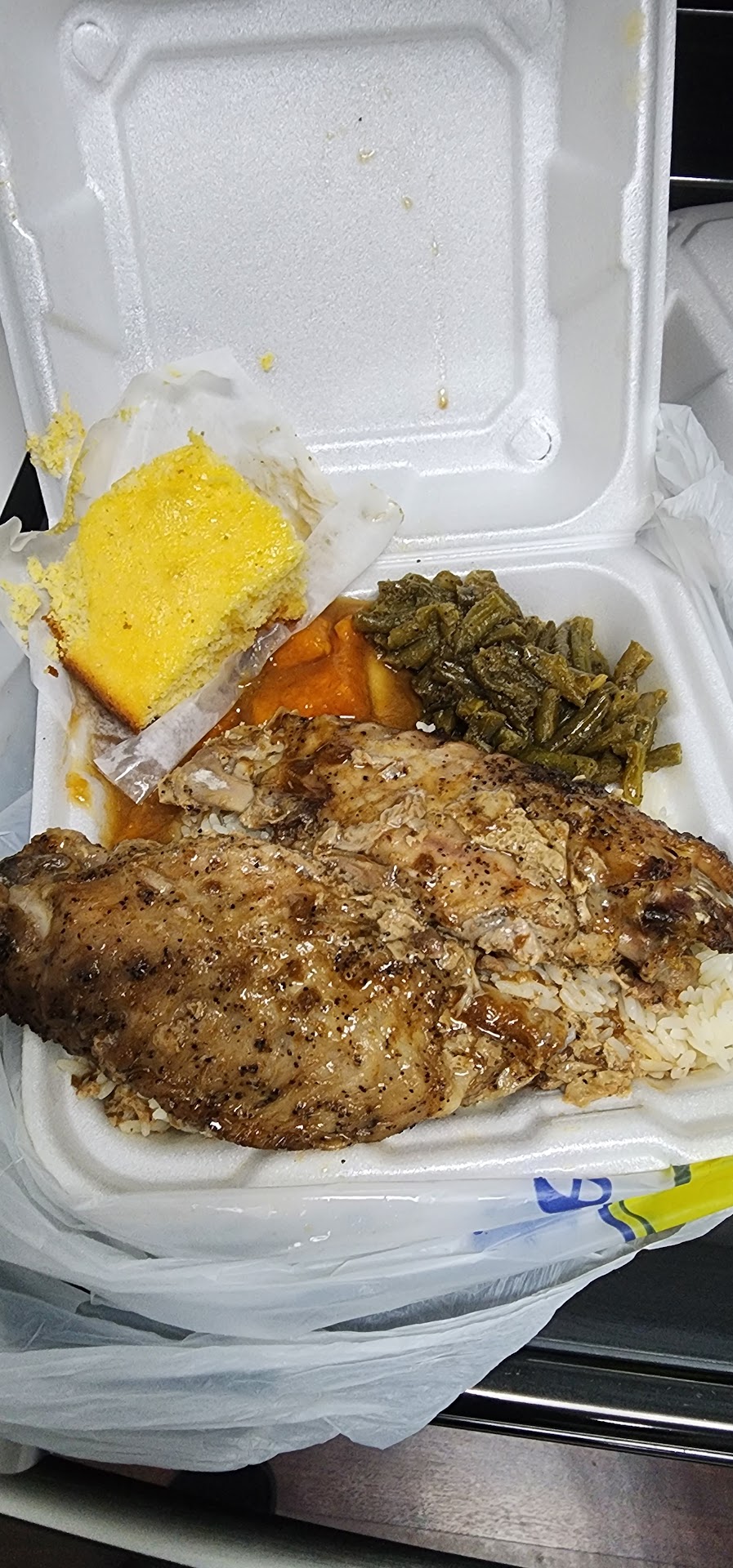 Well, they did not disappoint! The cook looks like he's all of fifteen years old, but this young man can flat out burn!!! The staff was so friendly and answered all of our questions with patience. We ordered everything: Ribs, Chicken, turkey, macaroni & cheese (not the same as mac & cheese), collard greens, potato salad, corn bread, souse, pigeon peas and rice and "Trap Cake"!!! I went back and found out this is 7-UP cake and I understand why the owner called it trap cake. From what I understand, all of their cakes are equally delicious. I will soon find out.