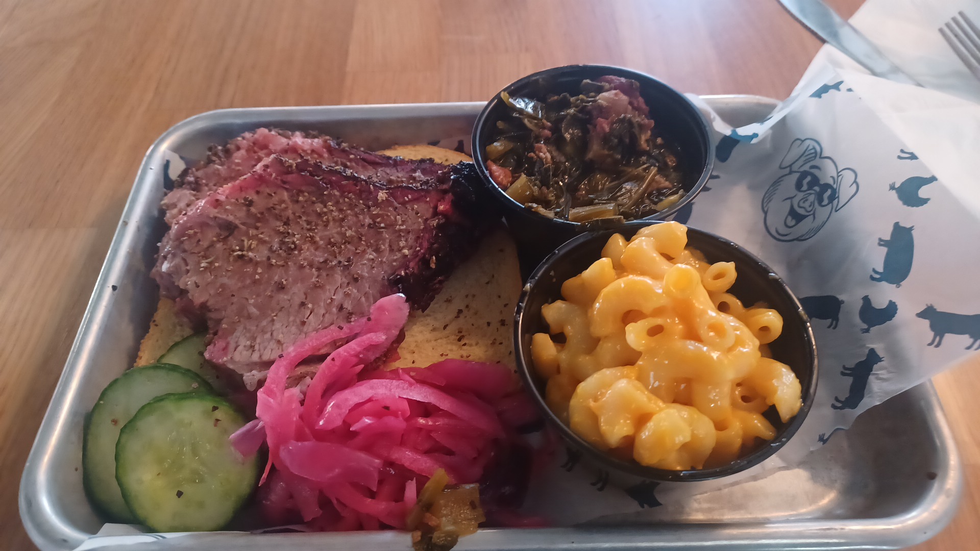 We got the sampler platter, which had a nice variety for two of us. However, the food was just barely warm. Nothing had a smoked flavor to it! Not one bit. The brisket was very tender and juicy. The turkey was relatively bland, the pulled pork was juicy and flavorful, as were the ribs. The collards were outstanding, and the baked beans were not great. Our meal came out to just over $85 for the platter, three sides, and two beers. Of course, you pay through the app, which starts with a 22% tip. Not sure who the tip is going to... there were several food runners but no actual service from them. No one checked on us throughout the meal.
