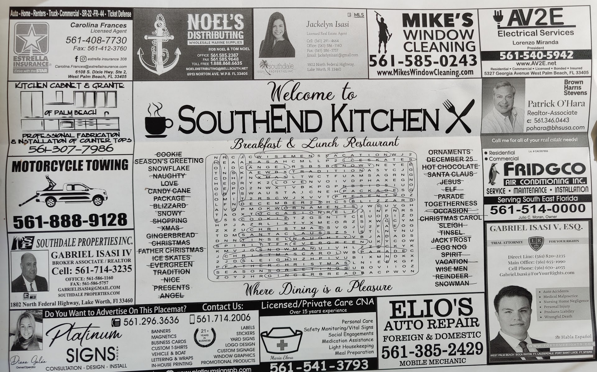 It's a quaint little hometown type cafe between Southern Blvd and Forest Hill Blvd, closer to Forest Hill, sitting on the East side of S Dixie Hwy. There is a neighborly feel to the place, very casual and warm with local (we saw mostly elder folks) patrons enjoying a quick bite. Loved the placemats, it was the old school ads as the border with a seasonal word find (my favorite! 😆). My son and I had breakfast here for the first time. The waiter was shy but friendly, food was good (better than a franchise chain place IMO) - my son commented on the pancakes being some of the best he's had. I personally like the simplicity of everything with this establishment. Total cost for two for breakfast before tax and tip was about $28 (2 OJs and each of us a breakfast meal). Similar average cost in comparison to surrounding breakfast/lunch establishments. This place would be a good addition to your local cafe rotation if you live in the area. There's a quiet atmosphere and service was quick. If you're visiting the area and don't want to wait, Thursday morning around 11am seemed like a good time to...