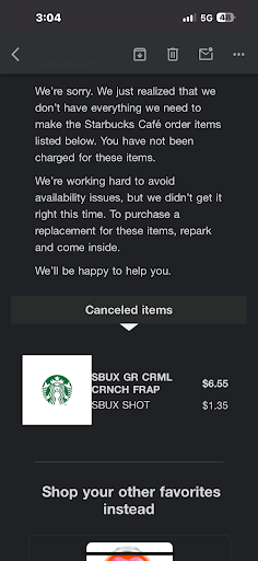 I arrive there and my egg bites and latte are ready along with an empty bag for the wrap with the words āSOLD OUTā written on the bag. Meanwhile, Iāve already been charged for the wrap.