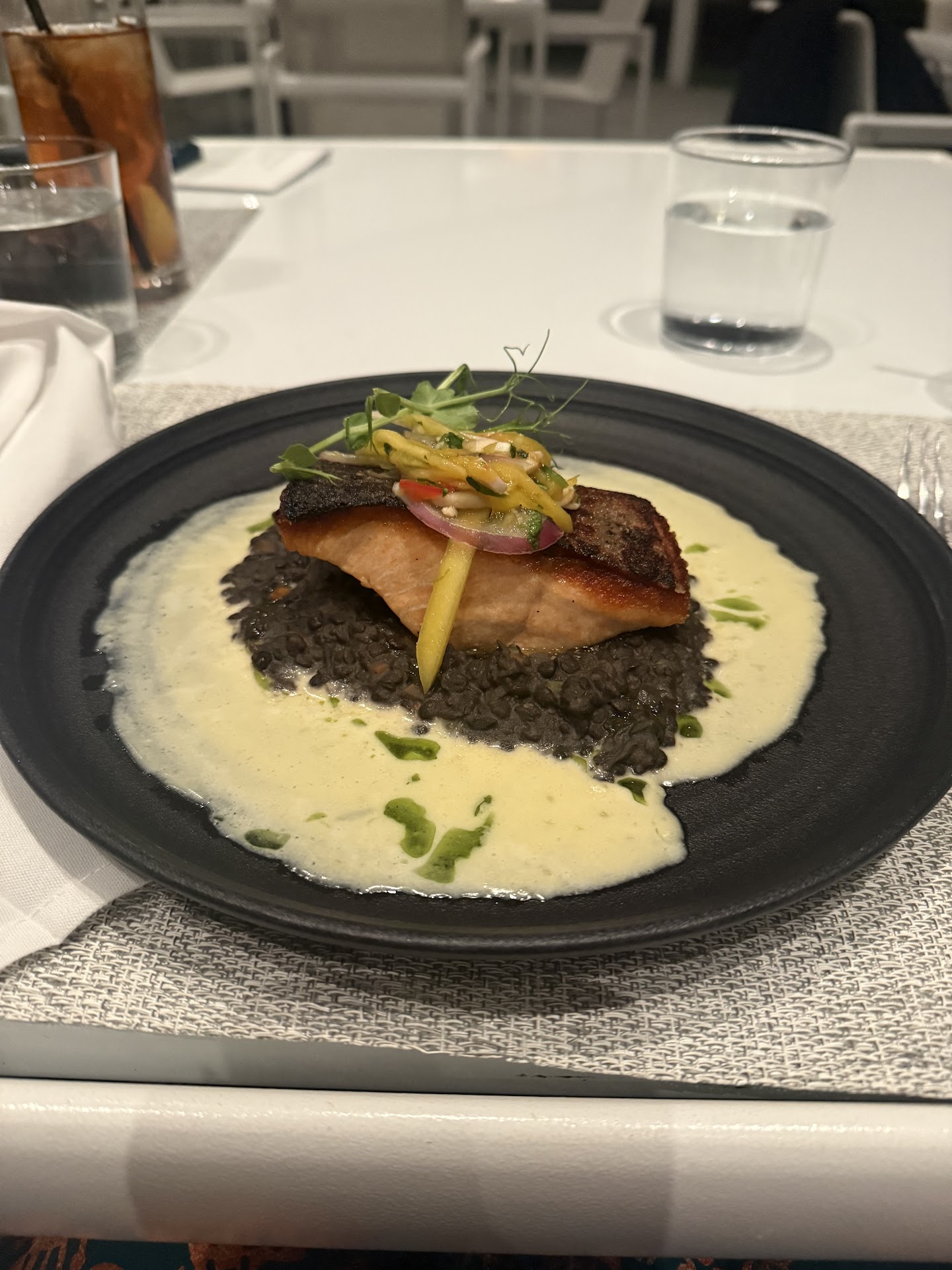 The crab bisque had too much pepper and it was really oily. The Salmon and lentils were blend! The lentils had no flavor, not even salt. My mother had the steak and fries, which also had no salt. The steak was overcooked on the edges and raw in the middle.