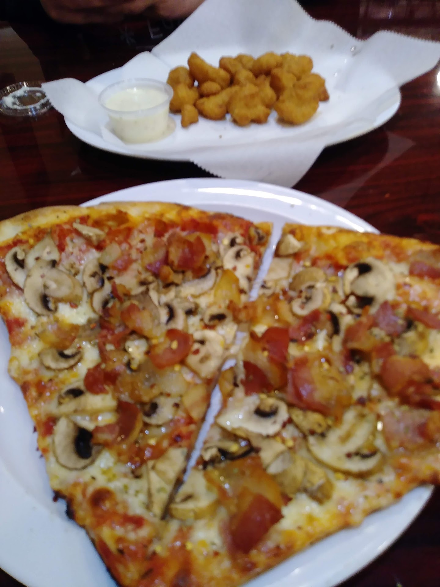 Unfortunately I have a negative review but hopefully it will help them to make a better slice of pizza, for those of us wanting just a slice or two. I stopped in for first time for 2 slices to go. The young kid, who helped me had no smile nor expression and no personality. I asked how big a slice was because the cheese pizza on the counter was covered by a pizza tray. He just stared at me. Then I had to ask again so he removed the lid to show me. I asked for mushrooms and sausage. Well, I certainly got a lot of both. Fresh mushrooms sliced thick, thrown on it, and kind of thick slices of some sort of sausage link. When I went to my car, the mushrooms were hard, half cold, and tasteless and the sausage was half warm. Worst slice I ever had. They need to precook the mushrooms to make tender and give flavor and not pile them on. I removed all my toppings and the cheese slice was very tasty. Good sauce and delicious crust. Wasted my money on...