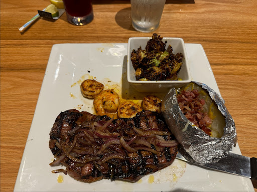 The NY strip was fine. It was cooked to medium per our request. The taste was reminiscent of your typical steakhouse, nothing unique to report there. The grilled onions were a bit strong (I believe purple onions), and a sweeter option like a Vidalia onion wouldāve been a better choice for this purpose in my opinion. Nonetheless, it didnāt take away from the overall taste profile of the dish. The grilled shrimp was seasoned well and paired well with the steak. The brussels were fried with a hint of sweetness. I enjoyed them. The loaded baked potato was good as well.