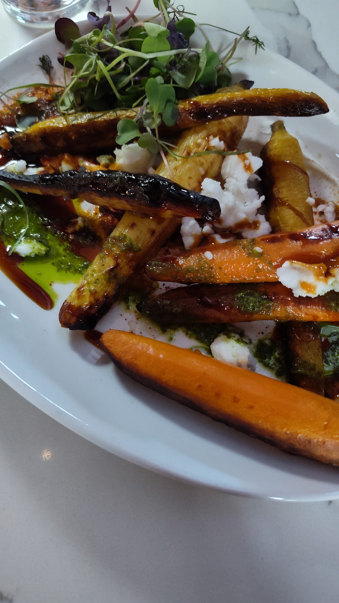 Read moreOverall I wouldn't go back, but my friends loved it! Atmosphere is very welcoming and different. Drinks are hand crafted and food is not your average menu. So high marks in all those areas. I just didn't enjoy my experience. Being vegan makes eating out tough, so I was thrilled to see a vegan side and main course option. I had the Moroccan carrots which were interesting and tasty, but not extraordinary, especially for $18. I also had the Miso caraflex for my main course. The server warned me that it was spicy and I was ok with that. Vegan food needs lots of flavor and I like some spice, but oh my!!!!! It was hot with chili pepper paste and oil. So unfortunately it was so hot and the heat kept building to the point that my mouth was on fire and I couldn't taste anything else. When I asked the server if there was anything they could do, they kindly brought me extra vegan yogurt sauce to help with the heat. It did help but I was almost afraid to eat much more because it was so very spicy. So I was disappointed with the only vegan option being a super spicy one and it wasn't offered to adjust the heat if need be. So after paying $45 for food that was beautiful but disappointing, I went across the street to Wendy's for...