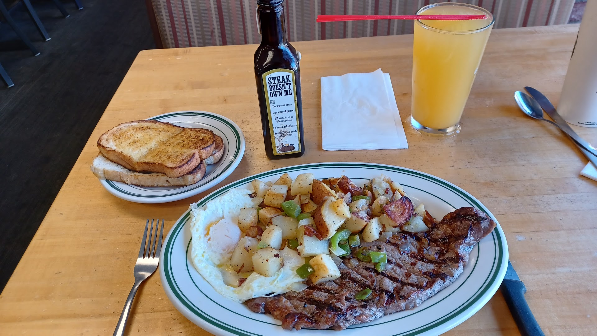 But while I was there, I saw that had a steak on the menu. So today, I returned for the steak. Look at the picture. It's 8 oz of meat, which I got with hash browns and sourdough toast. They have Smuckers jam so the today was great.