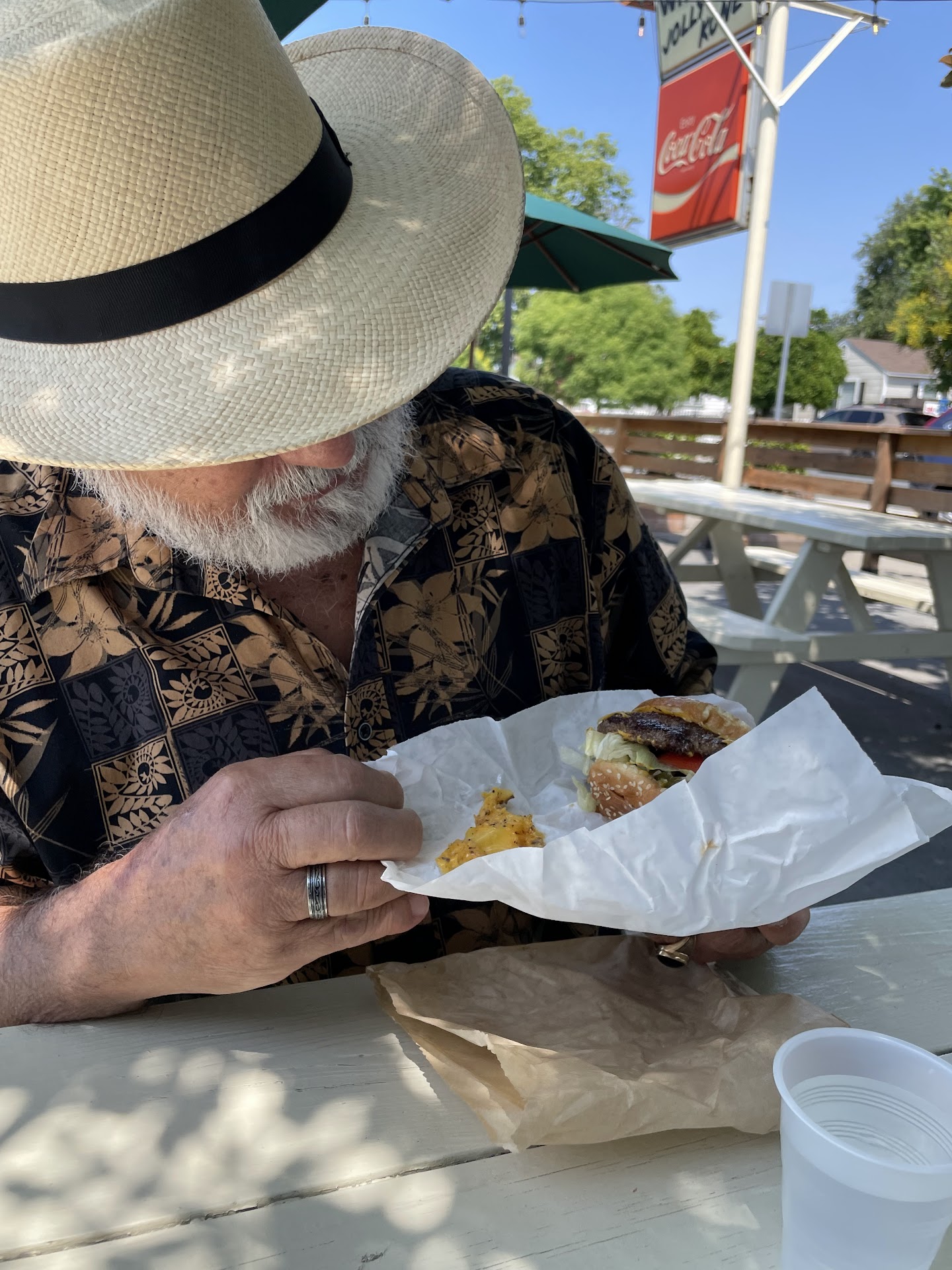 Read moreI heard about Whitey's a while back and decided to stop there while out for a 20 mile bike ride. Order counter is a walk up style and seating area is shaded outdoors with water misters at the 5 bench style tables nearest the counter. I perused the menu previously so I knew I wanted the Deluxe Double Burgerđ. Saw the peach shake was in season and figured why not, I'll burn the calories on my ride home. I was told it would be a 35 minute wait!! Turned out to be only a 10 minutesđ. Service was great. Double Burger(no cheese) at $6.50 it was a good 7. The ingredients were fresh but the patties could use a bit more seasoning for my taste. If you add bacon and cheese it'll probably add a ton of flavor and bump the score up to an 8 or 9. The smell of bacon wafting through the air had me regretting its omission. The Peach shake however, was phenomenal!! Although a bit pricey at $8 for a small (16oz), I'm inclined to say the splurge was kinda worth it. All in I spent $12.50. if you're hungry I would forego the shake and add fries and a drink instead. Definitely a nice spot to visit but they get busy around lunch time and seating can be limited so plan...
