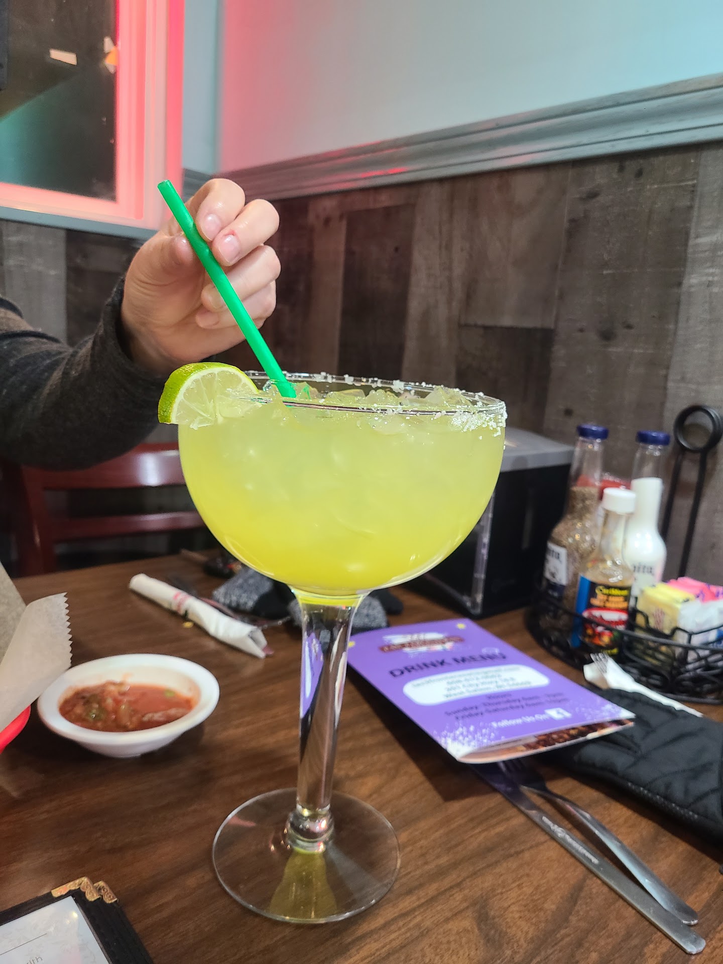 Decor is over done, to much flags,vases, just stuff around. Waiter took forever for drinks and brought chips and salsa(comp) after we asked for them. Chips were hot and salsa delicious. Ordered chicken fajitas....NO fajita taste at all just Grilled veggies and chicken. The refried bean NO taste...ick. Bring on the seasoned black beans.Same with rice, NO SAFFRIN FLAVOR just yellow colored rice. OK HERES THE KICKER...iF YOU ORDER "jalapeños poppers" THEY are served on the half with hamburger meat and cheese drizzled on them.NOT FRIED. They were ok. NEW RESTAURANT maybe...