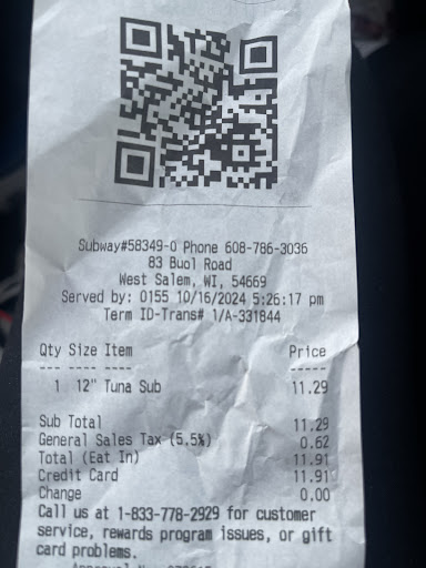 2/22/19 around 1035am watched a inspection person lick her fingers non-stop looking at papers talking to the manager. While he was making my sandwich she kept touching the food board that they slide the sandwichās down. I called her over to the drive-window and explained what I saw and and who she was!! WOW, the inspector to make sure the workers and doing their jobs right and she canāt even keep her fingers out of her mouth and touching where the food is!!!!! TERRIBLE!!! Also she was not happy that called her out on it!!!! Wish there was 0 stars, donāt even deserve a 1 star!!! West Salam WI subway in Town!!! Will NOT eat at subway ever again!! Said they made a new sandwich and they didnāt!! Even in the drive-window we customers can still see just so you know!! No other customers while I was there so he made my sandwich on the main food line vs in the back where they normally make them for the drive-window. Saw...