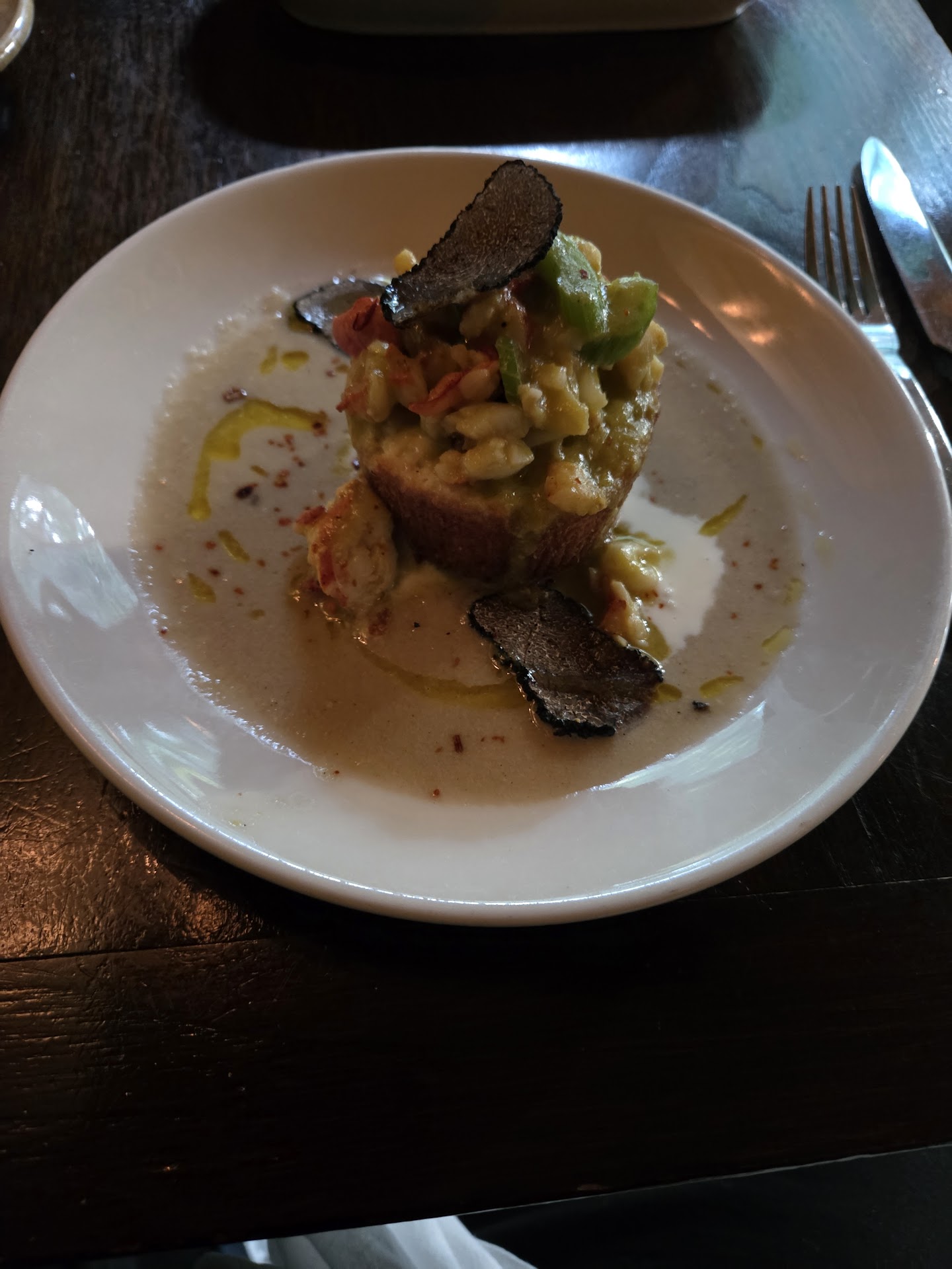 Read moreThe food is excellent! Hangar steak, swordfish, end of summer veg, shortrib, warm salad. Affogato and the apple dish were excellent meal enders. The downside is the service - the hostess dipped our menus in the table and walked away before we even had a chance to sit down. The restaurant is extremely dark (everyone is using phone flashlights to read the menu). We had a member of our party with a vision impairment and I kindly asked the hostess if we could possibly be moved to one of the multiple tables on the window because of this (it was an early seating), and she didn’t even try to make it work. The tables sat empty for most of the time we were there. The waiter seemed nice but never asked how the food was, weather I wanted another drink, etc. no one thanked us as we paid and left. A little more care in the front of the house would do wonders. Kitchen is 5 stars. I would suggest table lights that cast the light down - would allow diners to see their menu AND the food (which is beautiful when you shine your flashlight in it) while still maintaining the ambiance. We improvised by setting our phones atop wine glasses and casting a light down on the table. Like that there wasn’t loud...