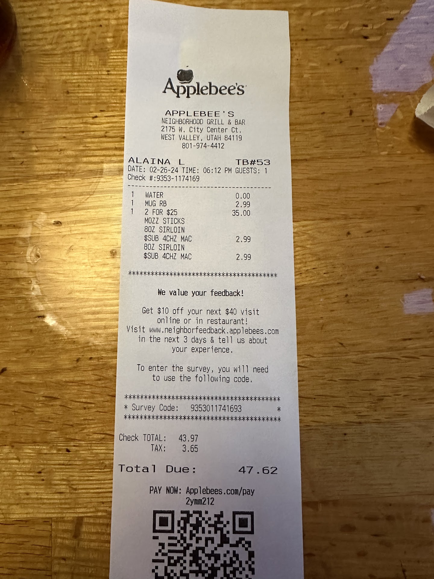 The thing that always annoys me about any sit down restaurant is when nobody offers to refill drinks or anything. I felt like I wasn't welcome there. Weird vibe and experience for New Years 2025. The food is always great at every Applebee's I go to so I will probably give it one more shot in Taylorsville instead next time. I wasnt sure what was going on. The server ans bartender seemed burned out or numb emotionally. Nobody working in the bar area smiled at any of their guests or seemed welcoming the entire time I was there that I could tell. I'm sure they were a bit annoyed he sat himself but we had a gift card and dont really frequent sit down chain restaurants. I have worked in restaurants and you don't need to be over the top or fake like the dude with the 37 pieces of flair on Office Space, but why not be pleasant...it helps the shifts go by faster. I hope they know they have the power to increase their tips based on level of service received.