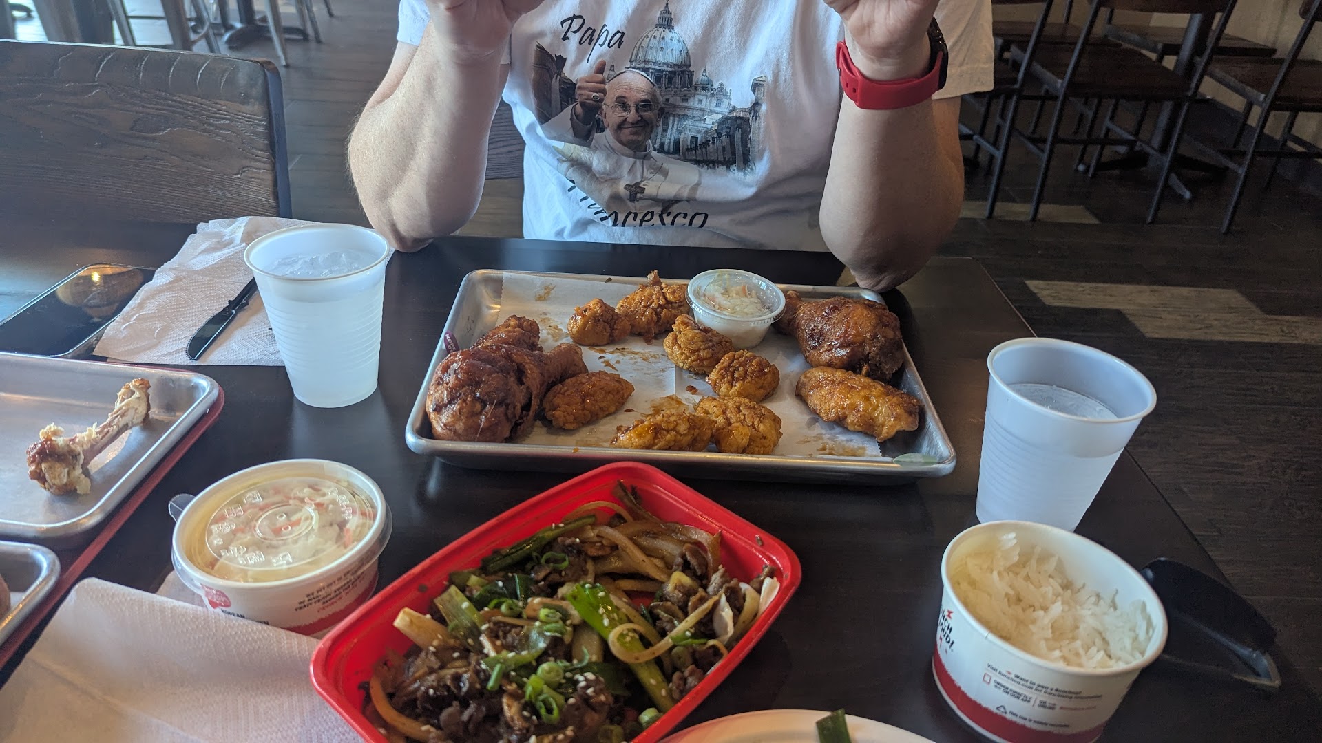 Had a late lunch at Bonchon, and it was great! When we told the person at the counter we hadn't been there before, they walked us through food options at the kiosk. My wife and I ordered soy garlic pork potstickers, japchae with fried egg, and a small mixed fried chicken (wings and drumsticks), and sides of steamed rice and pickled radish. Which we shared. I don't know how we would have eaten a larger order of chicken. The potstickers were delicious, with a slightly crispy texture, and lots of sauce on them. The japchae was a great tasting mix of vegetables, and adding the fried egg was perfect. We had 2 different sauces on the chicken, Korean BBQ, and Yangnyeom. They were incredibly crispy and crunchy! And the two flavors were excellent, with the yangnyeom being slightly spicier. The pickled radish was a perfect side with the chicken to balance out the heat of the sauce. So good! Definitely worth it! But next time, I need to try the kimchi...