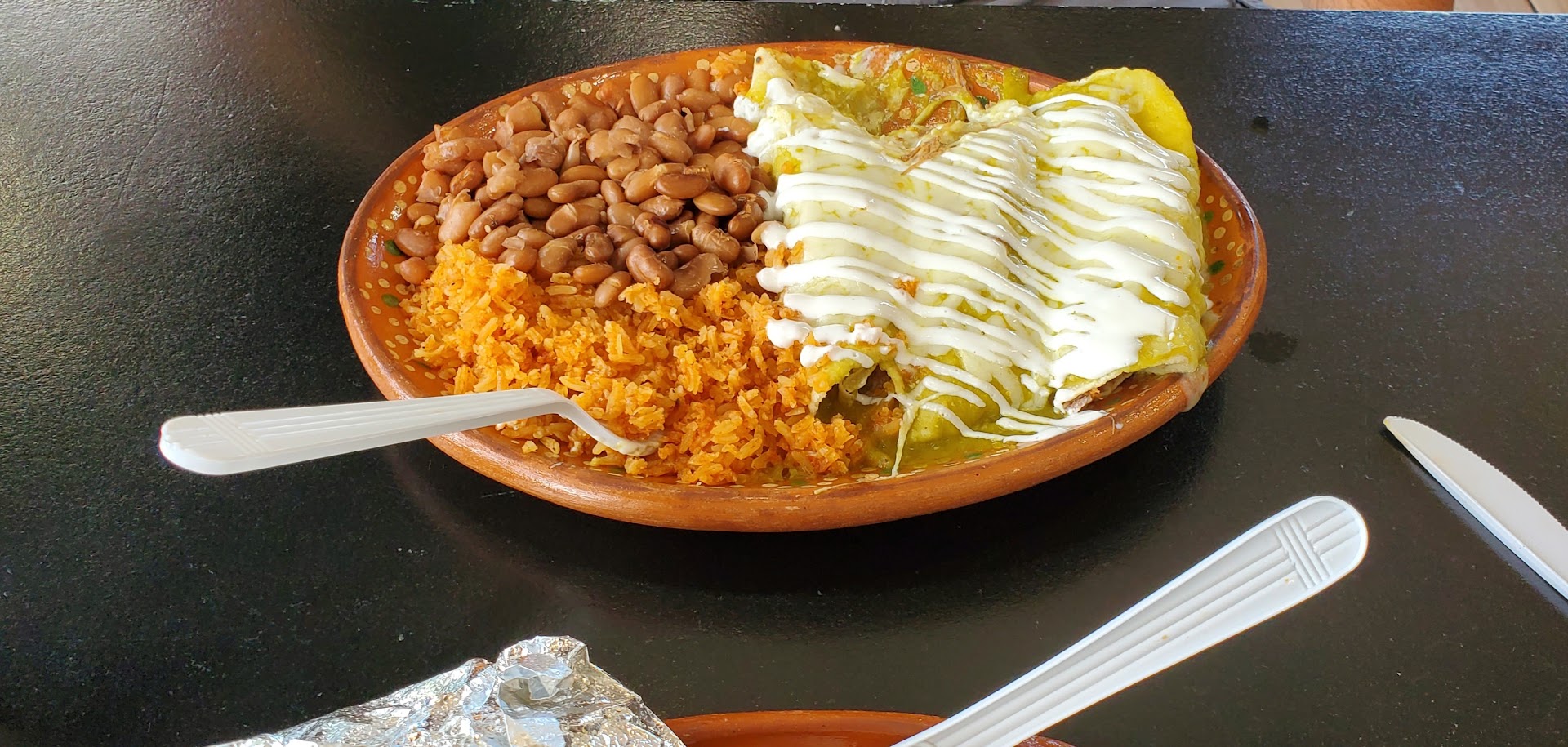 The Host(I guess) was nice, the server was also nice than there was 1 more server? They where all nice, but we waited longer than necessary for our drinks, I ordered water... took one small sip, it tasted like dirty water, like if it was the water they used to clean tables disgusting 😒 The food looked great when it came... it Was Not Good at all. I ordered (I thought) the birria plate which said it was 3 tacos and rice and beans and consome... I got a plate with meat, rice, and beans. The consome was not good. My husband ordered the green chili enchiladas, it tasted like cilantro so much he couldn't even eat it. DONT BE FOOLED BY PICTURES... it Looks good but did NOT taste good at all. 1st & Last time I'll be going there.