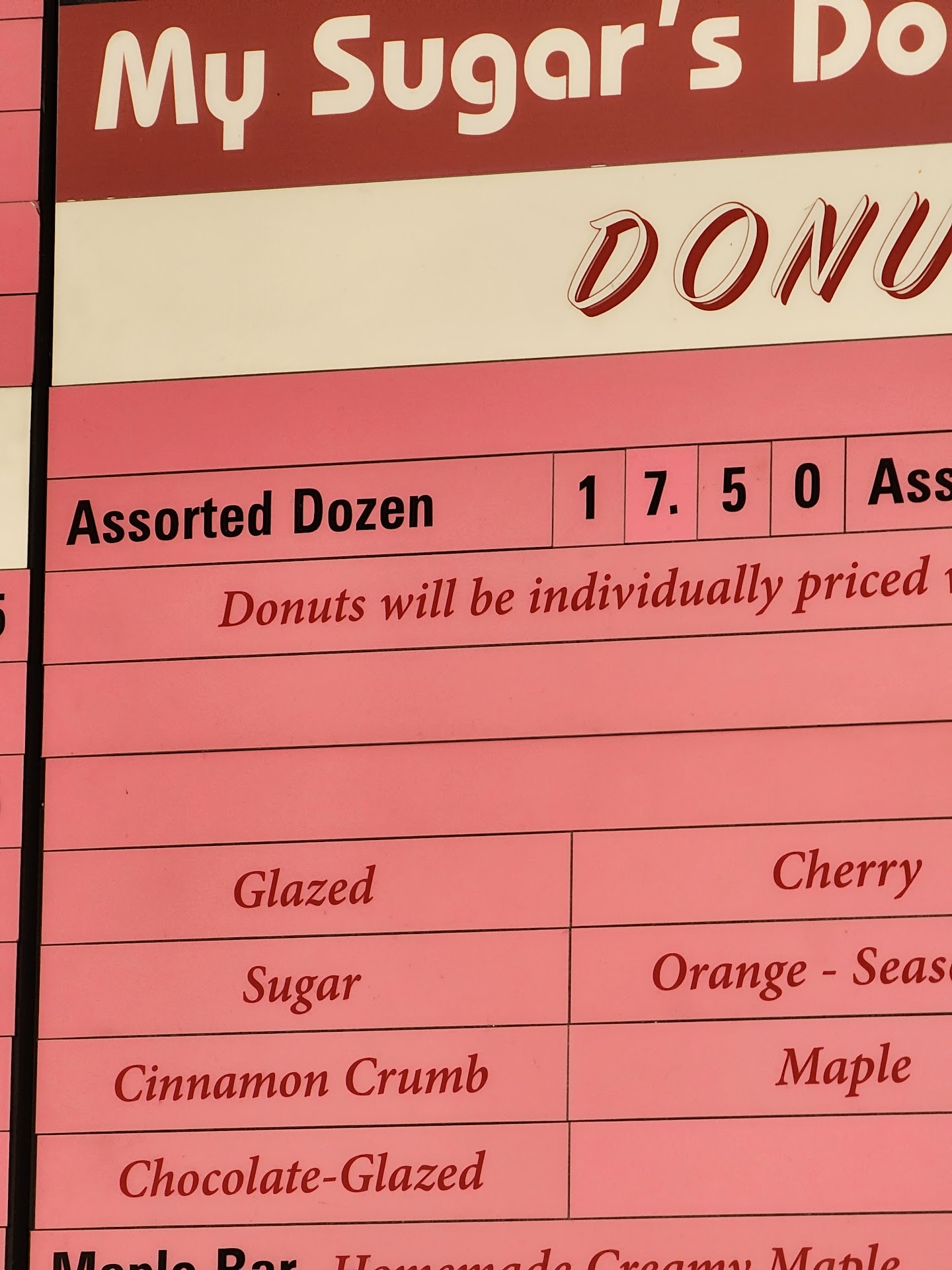 Read moreI don't even want to tell you about My Sugar's Donuts. Only because I love how there's rarely more than 1 person in front of you when you go here. It's the kind of family owned business that has great consistency without sacrificing quality. Their doughnuts are better than Banbury Cross's and give Darla's Doughnuts a run for their money!