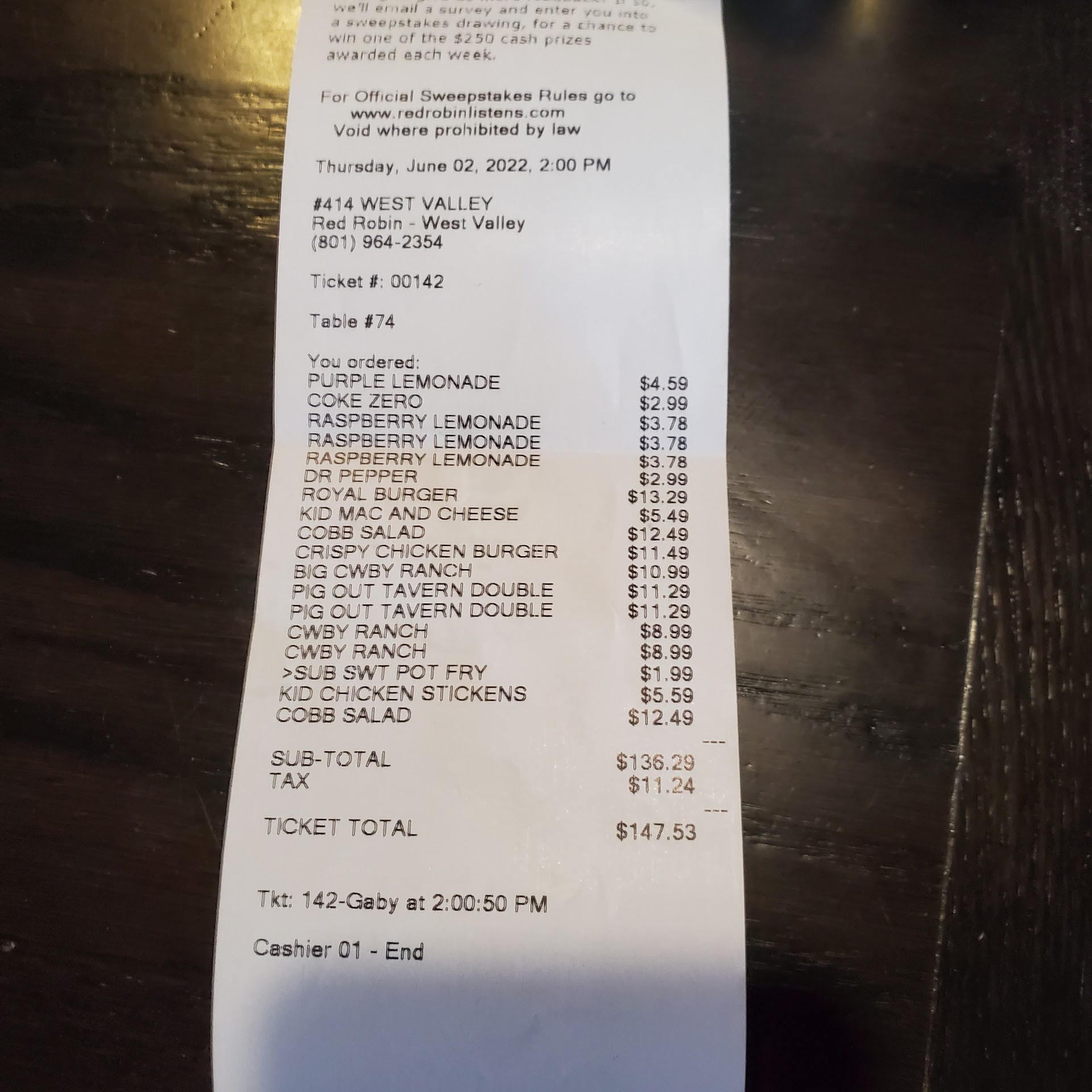 I am NOT in the latest impressed with the service spending close to $200 and would have been more than happy to give a $30 to $40+ tip. But the service wasn't the best, and our service was on snail mode and took over 2 hrs for our food and all. Unacceptable in my opinion! I won't be going back and I will definitely not recommend this Red Robin either. My daughter is a server at iHOP right up the street and I am sure we would have received better service.