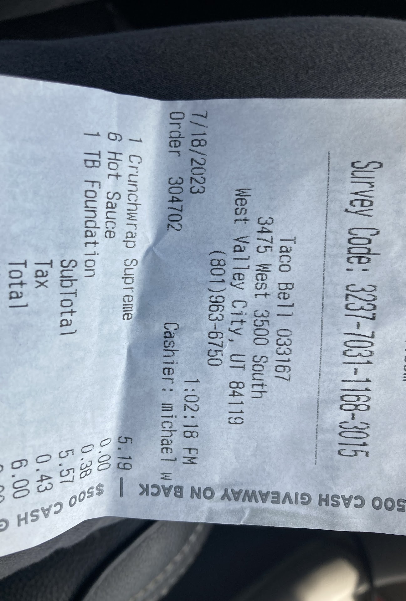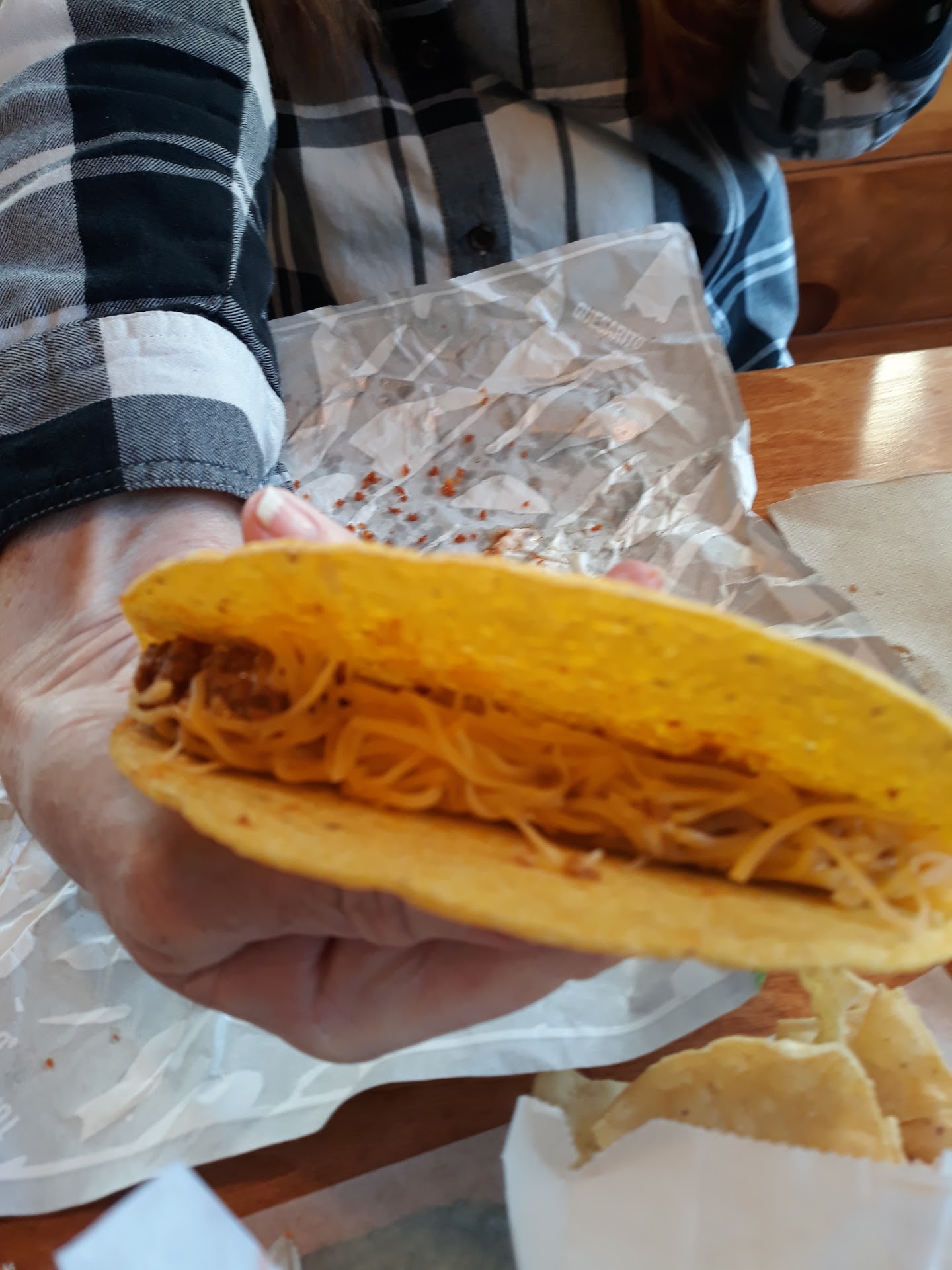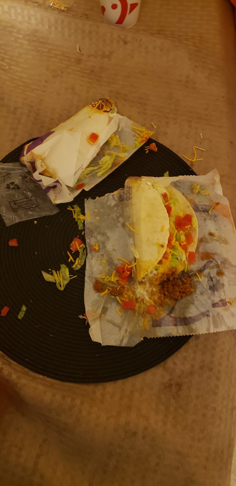 Read moreI guess it could be worse but it was still pretty bad. I found out they removed a bunch of favorite menu items while in the Drive-Thru. It was very busy. The line for the drive-thru was around the block but I waited anyway. Once we finally got up to the window our food came fairly quickly. We got it home and it was a sloppy mess. Everything was wet. I'm not sure from what. Several of the tacos weren't wrapped all the way and had spilled all through the bag. We fished out a handful of closed items and tried to salvage the meal. Then we found a hair in one of the soft tacos. Long and dark brown or black. We are all blond. I get it things happen. But I've had horrible luck with this location for nearly a decade. This was my first time back in years. I don't see any reason to go back to that location or Taco Bell in general. They don't offer anything I can't get somewhere else. Except for Baja Blast and I just don't care for it. I really don't think there's anything they can do to make it better. That was forty bucks wasted. Oh well...