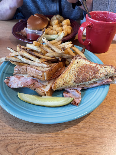 I ordered the Croque monsieur with tots and a slice of chocolate cake. And my husband got a bar-b-que sandwich with tots and corn chicken soup.