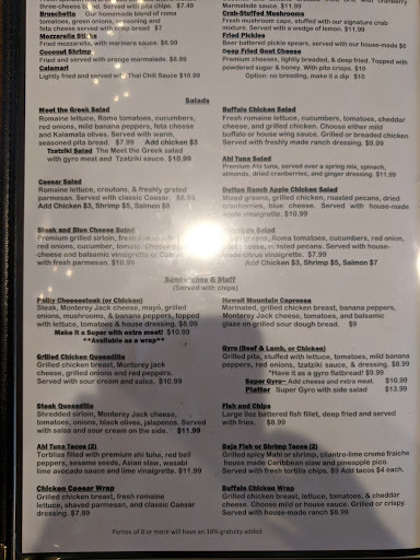 After looking at the variety of choices available, the menu being both varied & eclectic (Mexican, Greek, Seafood, & American dishes represented fairly equally), and the prices wildly fluctuating from one entree to another (from $8 Caesar salad to lobster ravioli hovering around $23), I settled on a Chicken Quesadilla, which came with tortilla chips (don't know why I didn't choose steak as it was only $1 more?). My wife wanted Shrimp Scampi Pasta, but it was no longer offered (yet the menu didn't reflect the change). She ordered the Greek Salad instead. We both ordered soft drinks to wash it all down. Both of our dishes were very large portions, and neither of us could eat our whole meal. Both meals were very good, but then again, neither of us ordered anything complicated. Around $24 for both meals & drinks, plus a $5 tip. I consider that moderately priced, considering the meals we ordered. Hence my dilemma on this review.