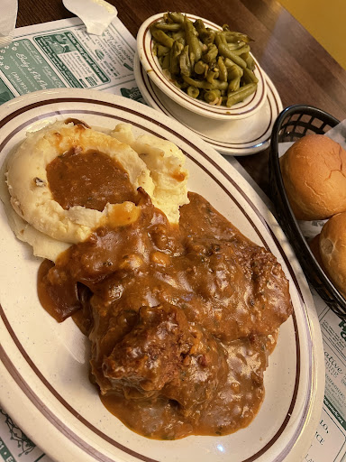 Got the Smothered Chicken & Meatloaf. Both were terrible. Baked potato was made at least the day before, was like a shoe. 2 small cjix breast for $13. The rice was mush and had an up charge for a bowl of shredded lettuce, called a salad even though you were supposed to get 2 sides. Blue cheese dressing was simply mayonnaise in a little container with BC written on it. The waitress and service was great and the lady at the register (whom looks like Judge Judy) is a gem. Oh.. The carpets in the place should be cause for the county to lock the doors. Since it's been here for years (I've been told) and is always packed, I can only assume the owners must be quite greedy, as it is OBVIOUS no money has been put back into the business in decades. The decor is late 70s Tudor. I think they are trying to be something you would find in a place like Gatlinburg, Branson or Asheville, but instead is a dated, large Waffle House without its famous chicken breast marinade. I find it hard to patronize a place where it's clearly doing business but the owners put nothing back into the business. When the clientele that packed this place dies off, which is not long.. Seriously. They will not appeal to the next generation, unless they do some major cleaning, painting and updating. The most clean and modern part of the place was their gift shop. It's a shame because I don't like chain, big Corp eateries, but clearly the owners take the money and run at this...