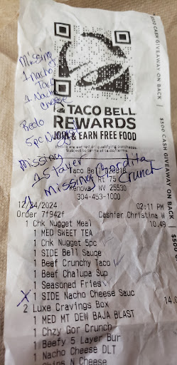 Read moreForgot one of my cheesy double beef burritos. I said no lettuce on my soft tacos and all soft tacos had lettuce. Mind you my cheesy double beef burrito was busting out the seams ! I had to wait until I got back to Barboursville to eat it by then it was cold. Then I was gonna call and tell them that they shorted me A burrito, but I trusted Taco Bell and threw the dang thing away. Whatever I’m out three dollars I don’t care. But with me having knowledge of being a manager at a fast food restaurant, I didn’t need to know that one of your employees walked out. I didn’t need to know that you were backed up because another employee decided they wanted to go smoke a cigarette as you guys were getting busy. And I feel sorry for the lady that literally told me her whole life business about chemo. Honestly, I wasted $14 because nothing was made right I was missing a taco. Also, why is it acceptable for people to wear nails especially long nails! It’s absolutely disgusting working in fast food because of bacteria !!! 🦠 🤮 I honestly will never order from this Taco Bell again because this is not my only bad experience from that place. Let me add that I did try to drive back and just replace the taco that they missed because I didn’t have a receipt. The line was out to the road. People are confused. Why the lobby is closed maybe put a sign on the door instead of Haley running around cussing while I’m sitting at drive-through waiting on my food and can see everything going on. It’s literally common sense put a sign on the door if the lobby is closed instead of getting mad at the customer About going to the side door. Because how did the customer know that the lobby is closed if there’s no sign? It’s...