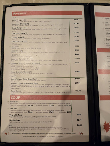 Read moreWe were passing through West Virginia on our way to Indiana. The town of Hurricane (what a great name!) was halfway so we opted to spend the night there. As an aside, we stayed at the Holiday Inn Express which seems to be the best option in the area. Perusing Google and Yelp, I saw lots of favorable reviews for Thai Valley Kitchen. Huh, in West Virginia? What the heck – we decided to give it a try. All I can say is “Wow”. What a hidden jewel. Don’t be deceived by the exterior or half vacant strip mall. The interior is open and cheery. The wait staff is accommodating and very sweet. We ordered a glass of Deloach Merlot, and they poured a nice size serving. For dinner, we shared egg rolls, the Tuna Tower and the Seared Tuna. Everything was delicious! We were both jockeying to get the last bite. The Tuna was seared on the outside and raw on the inside. It came with a mango salsa that matched perfectly. Now, I could go on and on about the tuna tower. It is a pile of spicy, tender tuna chunks on top of more chunks of avocado and mango. We could have eaten another one! I will say it was a bit zesty for us but that didn’t stop us from wolfing it down. When we asked, the waitress did respond that they can make it less spicy – duly noted for the next time. Please open a restaurant in Ruckersville, VA!...