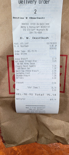 Read moreWe waited in the drive thru for over 20 for 2 frosties and a chicken sandwich. There were 6-7 cars in front of us. Three pulled away, 2 before ordering 1 after(without their orders.) Cashier at the window was not paying attention to anything I had to say and took the money but didn't scan the app for the discount. It was a mess. That was another 10 minute ordeal...a teen manager comes to fix it and was over the top clueless then rude finally determines I had to make another purchase to use the coupon? What kinda bs is that. It's a dollar off coupon. Meanwhile, over in the passenger seat the bottom is dropping out of the Type 1 diabetics blood sugar and I can't get anyone to just hand over a one of the frosty's is already paid for and the reason we were there in the first place! For a $3.18 total purchase it's 30+ minutes of inexperienced. At the end of it all, I ask the "manager" her name...she became more rude as the $1 off coupon debacle unfolded (until finally saying to the cashier "give her a dollar and get her out of the drive thru. Yes I want your name. She refused, I ask the cashier 2hat her managers name was and she was instructed not to give it. Hmmm...why would a manager not want to give their name upon customer request? If your looking for a waste of time, tried patience and unbelievably terrible customer service, head to Wendy's in Cross Lanes WV. They are...
