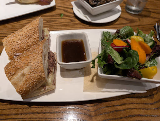 Wish I had a better experience. I HATE leaving negative reviews. Wish I could find a reason or excuse to say hey maybe they were extremely busy or short staffed but everyone is working hard so let's forgive and forget. I am always quick to notice those situations and understand. Not this time. Sat at bar for dinner, always feel like bar is best place for service. Just didn't work out that way tonight. Stranger next to me orders French onion soup, comes out in less than 10 minutes. My wife and I order hummus appetizer and French onion soup. Hummus comes out 20 minutes later. Soup nowhere to be found. Eventually after hummus was gone the bartender came our way and I mention the soup. She says it's on its way. I ordered it as an appetizer. The same stranger next to me who already ate his soup ordered his entree steak meal about 10 minutes after we placed our order and it came out and he ate it BEFORE my soup arrived. Soup eventually arrived without a spoon. So I had to wait to flag down bartenders again for a spoon. Was given a large tablespoon. Great. Hummus was good, no complaints there. Soup was awful. So much salt that my wife actually commented that she could smell the salt sitting next to me that's how bad it was. Our entrees were ordered same time as our apps and they didn't arrive for over an hour. I watched parties of 8 sit down same time as us, order after us and their food arrived well before ours. Watched much of the same with other parties in and around the bar area. Sat down well after us, ordered meals after we did, and were finished eating their meals before ours even arrived. Some had already paid and left. By the way, our meals consisted of a Greek salad and 2 orders of chicken caprese sandwiches. I didn't think we were talking about extensive orders. When food finally arrived it wasn't anything special. Chicken caprese sandwich was somewhat dry. Thought my wife's salad looked okay but she said it had too much salt on it, how and why I don't understand. I try to find the good in dining experiences, even when they arent as great as expected. I understand there are people working to make a living or working a part time job for extra cash and I respect that, but tonight was just not a great experience and I can't give them a pass. There were 3 bartenders and there just wasn't a whole lot of hustle and we sat oftentimes for long periods of time unattended. Drinks unfilled. Without silverware. Without dishware. Having to wait for them to get somewhat close to flag them down and ask for things which we should have already had. Sometimes a bad service night can be offset by good food, vice versa. Just not the case here. Not good all around tonight. 2 stars is generous. 1 star for food quality/service and an extra star for atmosphere. Restaurant itself is nice and has...