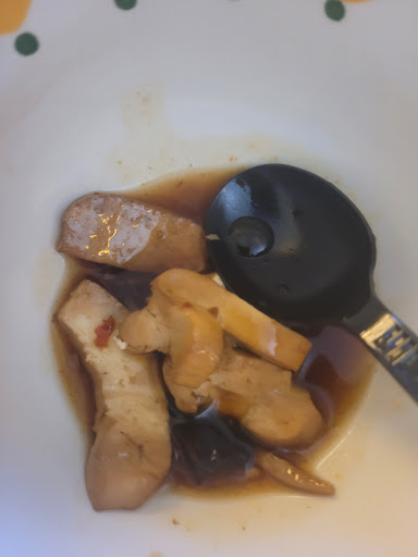 The Mongolian beef, which I expected to be beef with green onions, was bits of rubbery, underseasoned meat mixed with a random assortment of vegetable pieces. No onions, green or otherwise, but some mushrooms (maybe?) and a couple of bits of red pepper. It was also a very sparse amount, there was only about 1/4 cup of beef. I know, because I pulled it out to try to reseason and salvage dinner. And it's not like they skimped on the meat and gave a lot of vegetables either. There was only about 1/3 cup of vegetables including the brown, floppy, mushroom-like things. This dish cost more than $17!
