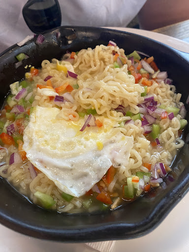 The āIndian Ramen Skilletā sounded amazing in theory ā I imagined a dry, seasoned, baked ramen dish with some crispy edges and spice. What I got was the complete opposite: a cold skillet pan used as a plate, filled with bland, soupy cup-o-noodles topped with raw peppers, onions, and an overdone fried egg⦠thatās it⦠not even a spoon. For $21, youāre better off buying a skillet, a 20-pack of ramen, and some veggies from the grocery store a couple shops down ā or better yet, go next door for an actual bowl of authentic ramen at half the price.