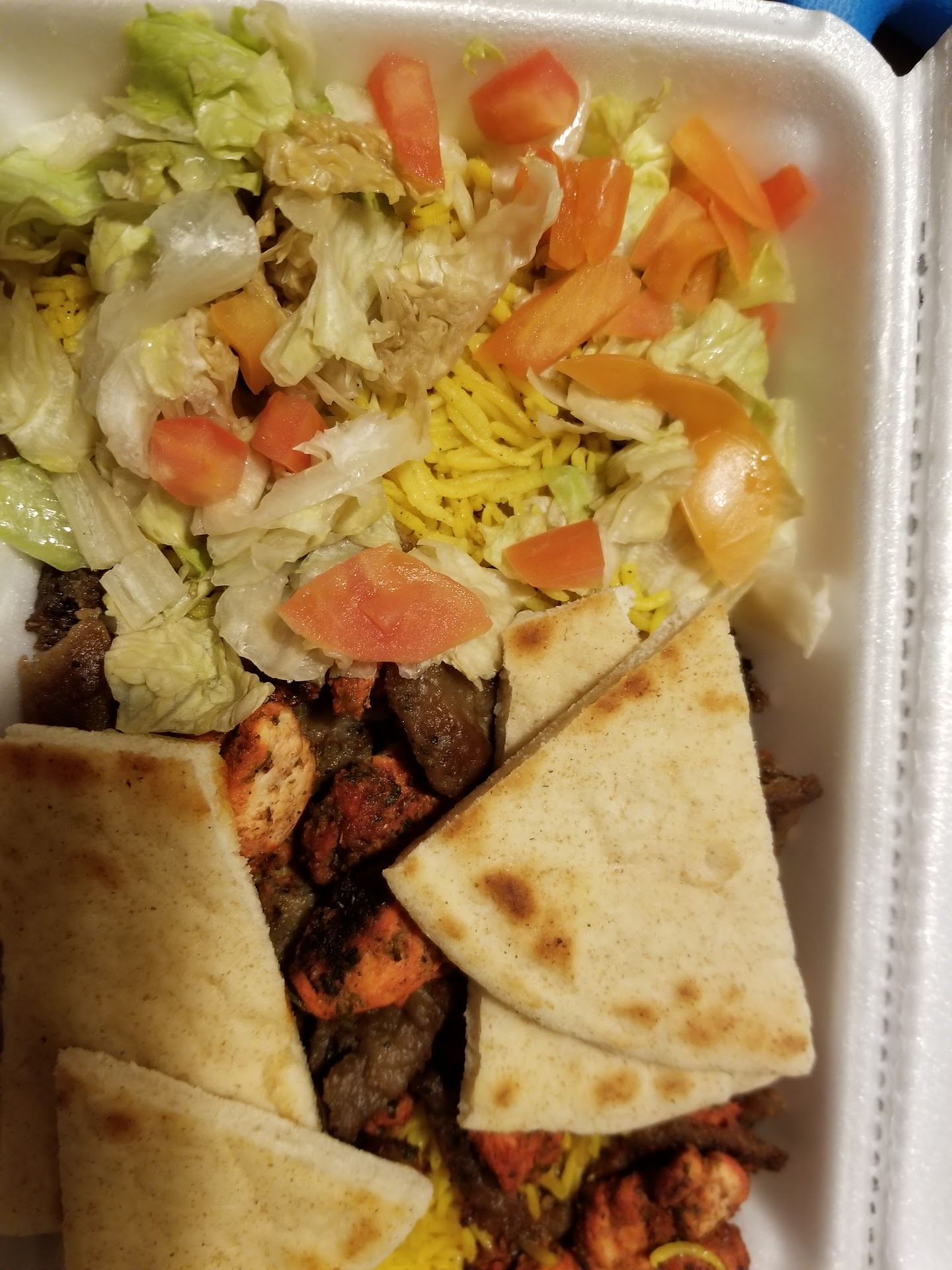 We ordered the mix gyro platter, a falafel sandwich and the jalapeño crunch burger with fries. Let me start by saying I've had halal burgers before and they're fantastic. My burger was way small and the lettuce was not crunchy or fresh, in fact the platter had wilted brown lettuce leaves. The falafel sandwich was ok but the pita on this and in the platter tasted like it was left out from the morning. The platter was filled with dry rice, again like it was made this morning and left out. Great concept, decent execution, but not exactly top quality when things are left to rot throughout the day without refreshing it. Will have to try earlier in the day to see if it will get an edit to 4-5 stars or if it will fall to a 1-2 star. Photos of the sub par lettuce in the platter. I assure you that's not a filter, and those brown bits weren't chicken... the lettuce was that brown, we'll see if...