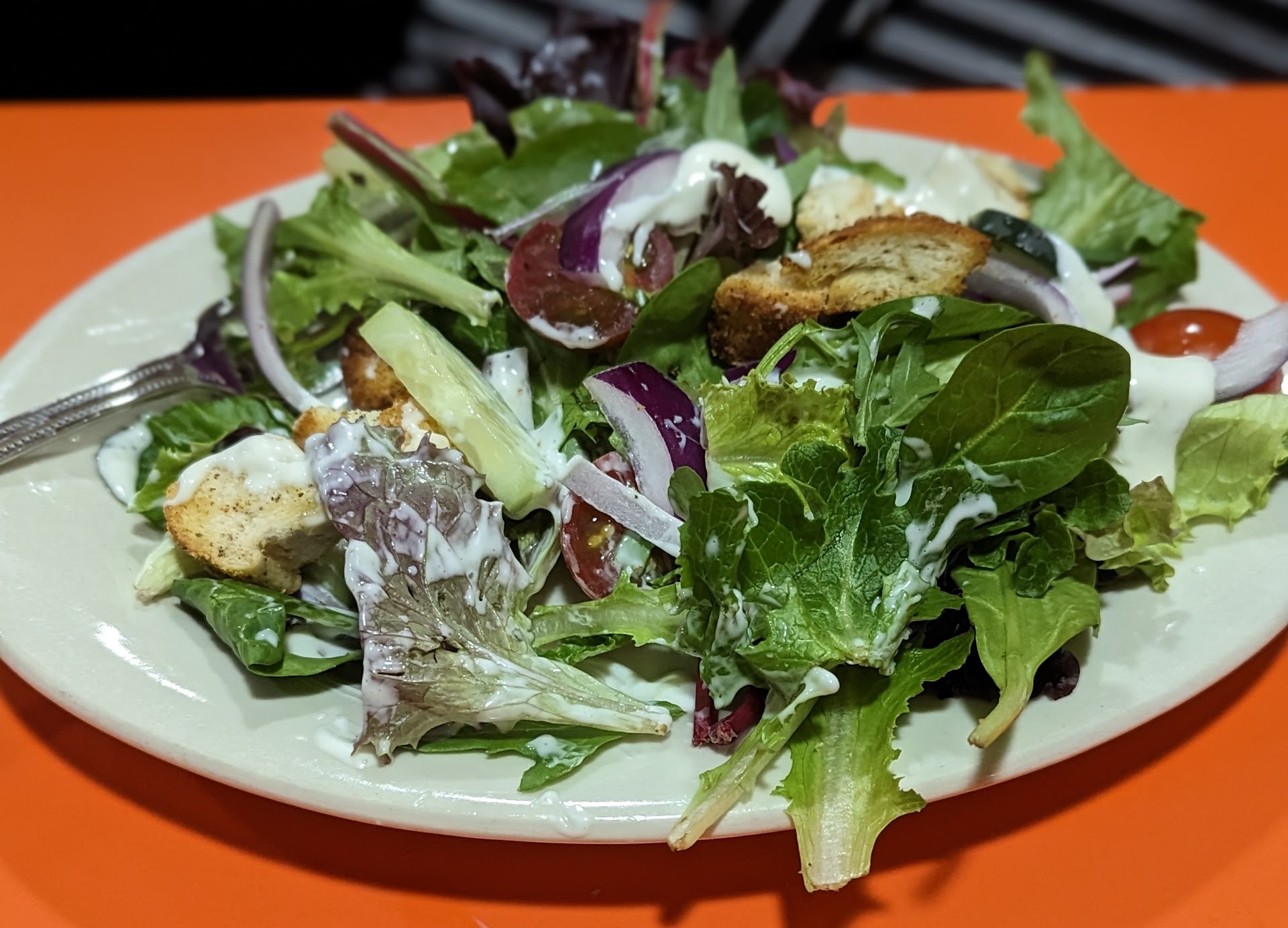 I ordered a cup of cappelletti soup, while my girlfriend ordered a salad with a side of ranch dressing. The salad was average, consisting of greens, red onions, and croutons. The soup was very bland, comparable to a Wonton soup instead of a chicken broth.