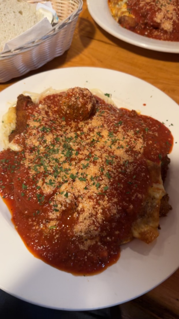 For my entree, I ordered the lasagna which was buried in a flavorless, slightly overcooked "meat" sauce that consisted of a small, lone meatball sitting on top of the lasagna. There was no meat between the layers, very little ricotta cheese, and a slightly moderate amount of Muenster cheese.