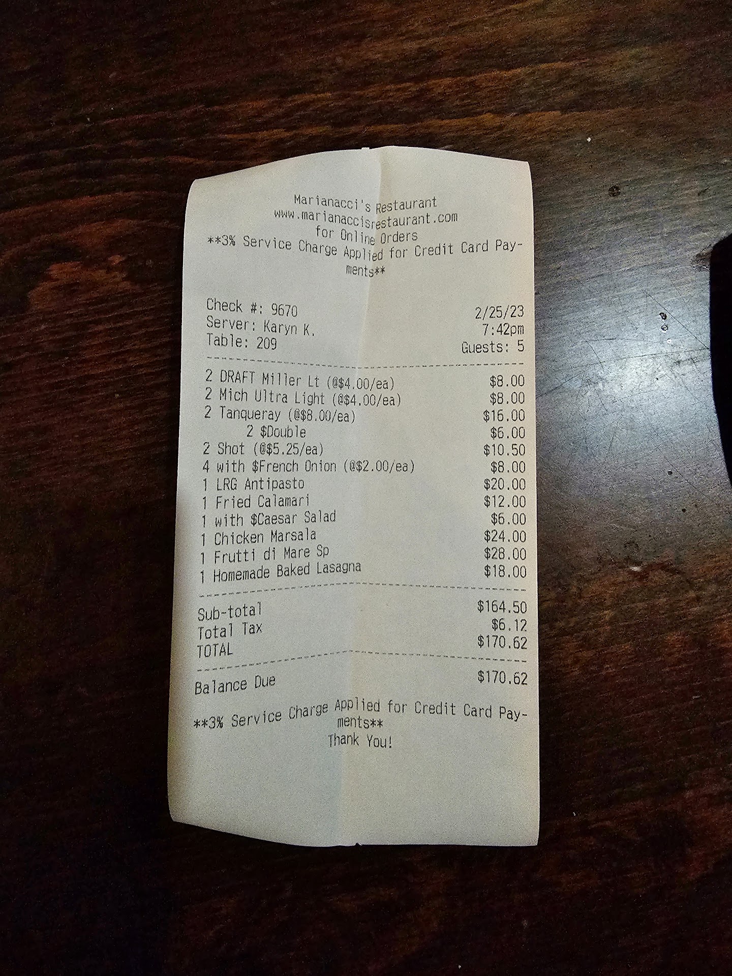 Patronized this restaurant often usually with a great dining experience. Made reservations for table of 5 for a get together anniversary dinner. Over an hour for entrees to come out & NOT busy at all ! Upgraded our soups to French onion which all barely had any melted cheese & overly salty. Dominic M. came out asking how everything was as we waited in more long anticipation of dinner..... The couple celebrating their anniversary both ordered the tripe dinners....Finally our dinners came out. Both tripe dinners were of a very strong burnt taste as was confirmed by all at our table...the tripe was burnt & served! ?? Waitress NEVER followed up to check how meals were & had to locate another waitress to address the 2 botched burnt meals which were remade as our dinner time together eroded away yet again in more dissapointment. Dominic came to apologize & at a loss for what happened. Dom delivered the meals, however at this point they asked for takeout as too much time passed pushing a 2 hour dinner tour with no follow up accommodations made in the interim. Waitress asking "if we wanted dessert"! I thought was a joke, given 2 diners experience were blown up not even eating! Check came reflecting the total which I felt was completely unsatisfactory given these circumstances & kindly asked for an adjustment for this huge dissapointing dining experience which I feel should of been automatic. As pictured the 2 tripe dinners are not on the bill. Gladly would rather of had things work out & feel Dominic dropped the ball & could of addressed the couple with a comp drink or simple "we value your business". Not much care given to the table in light of this chaos...plus you forgot my meatball on...