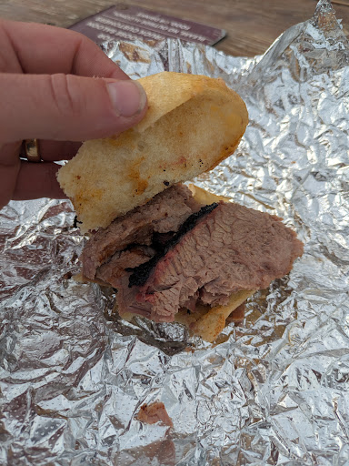 Would not eat here again. We got a 1/2 lb of brisket and a brisket sandwich. You do not get any pickles, onions, or sliced bread on the side. They have a few okay bbq sauces that they keep at the window. Not very friendly service either but that would be fine if the food spoke for itself which it didn’t. Brisket was somehow dry and fatty at the same time. The bark wasn’t good or flavorful. We had to overload it with bbq sauce to eat it. When we grabbed our food and started grabbing some bbq sauce at the counter, I guess they had accidentally given us some beans on the side and I opened them to see what it was, surprised that the sandwich came with a side. Then they asked for it back because they accidentally gave it to us, which just highlighted the very lackluster experience. You also have to eat outside in the heat. There are some umbrellas but overall it was an annoying experience and a waste of money. Only good part of the experience was the music coming from the...
